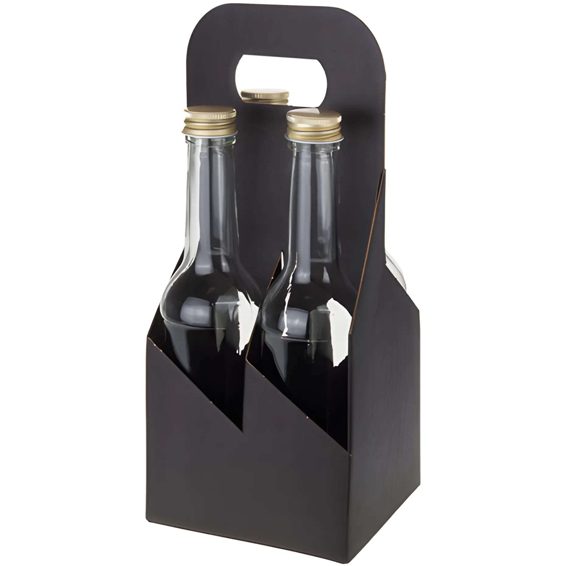 Dieser offene Flaschenkarton in angesagtem Schwarz verwahrt vier mittelgroße Flaschen kompakt und stilvoll beim Transport. Durch den cleveren Faltmechanismus ist er in einem Handgriff einsatzbereit, der praktische Tragegriff erleichtert die Handhabung. Stege aus Karton sorgen für den sicheren Stand der Flaschen und verhindern im oberen Bereich ein Aneinanderstoßen. Aufgrund der klaren Linienführung, der edlen Farbe und des stabilen, hochwertigen Materials wirkt der Karton besonders stylisch und eignet sich somit auch hervorragend zur Produktpräsentation oder als Geschenkverpackung.