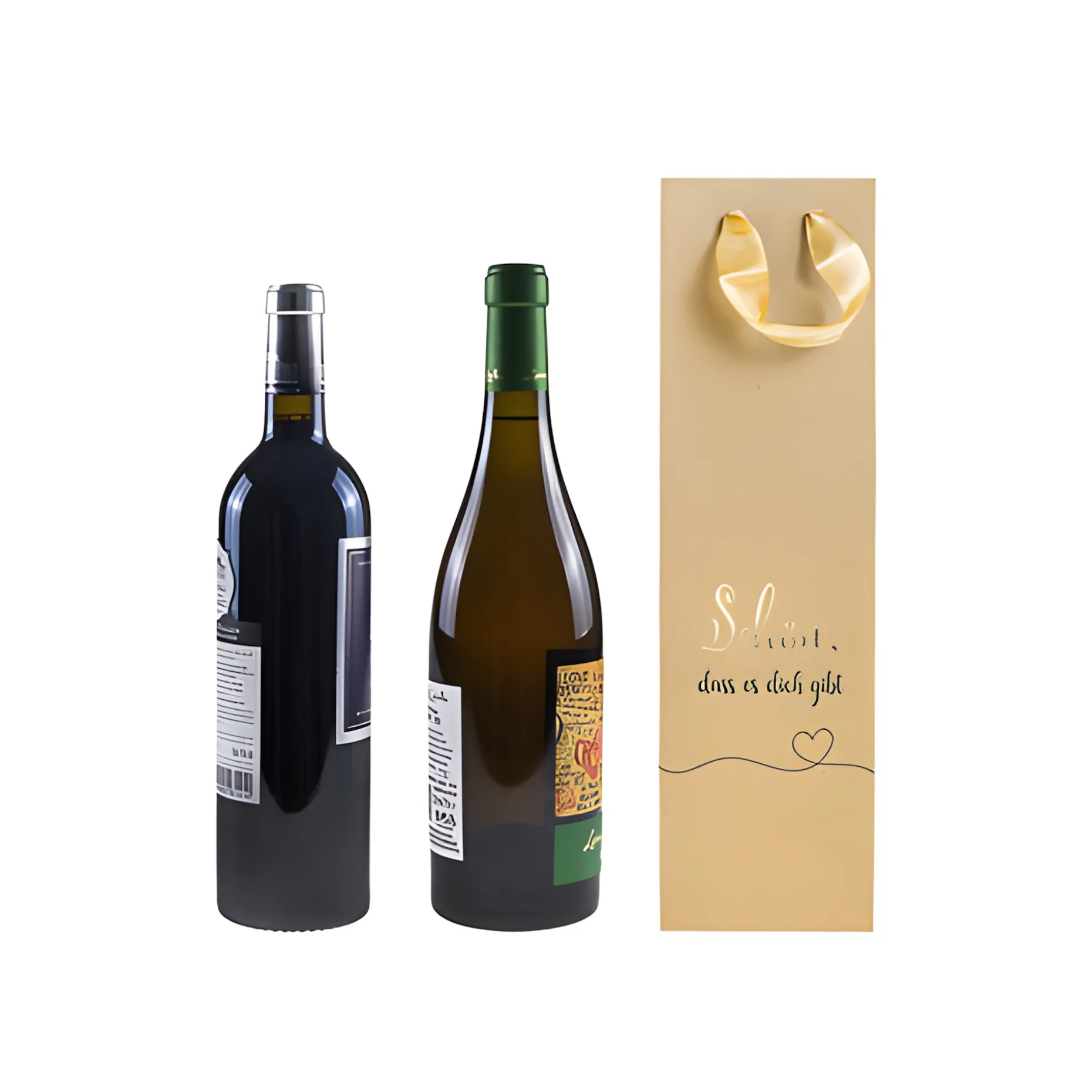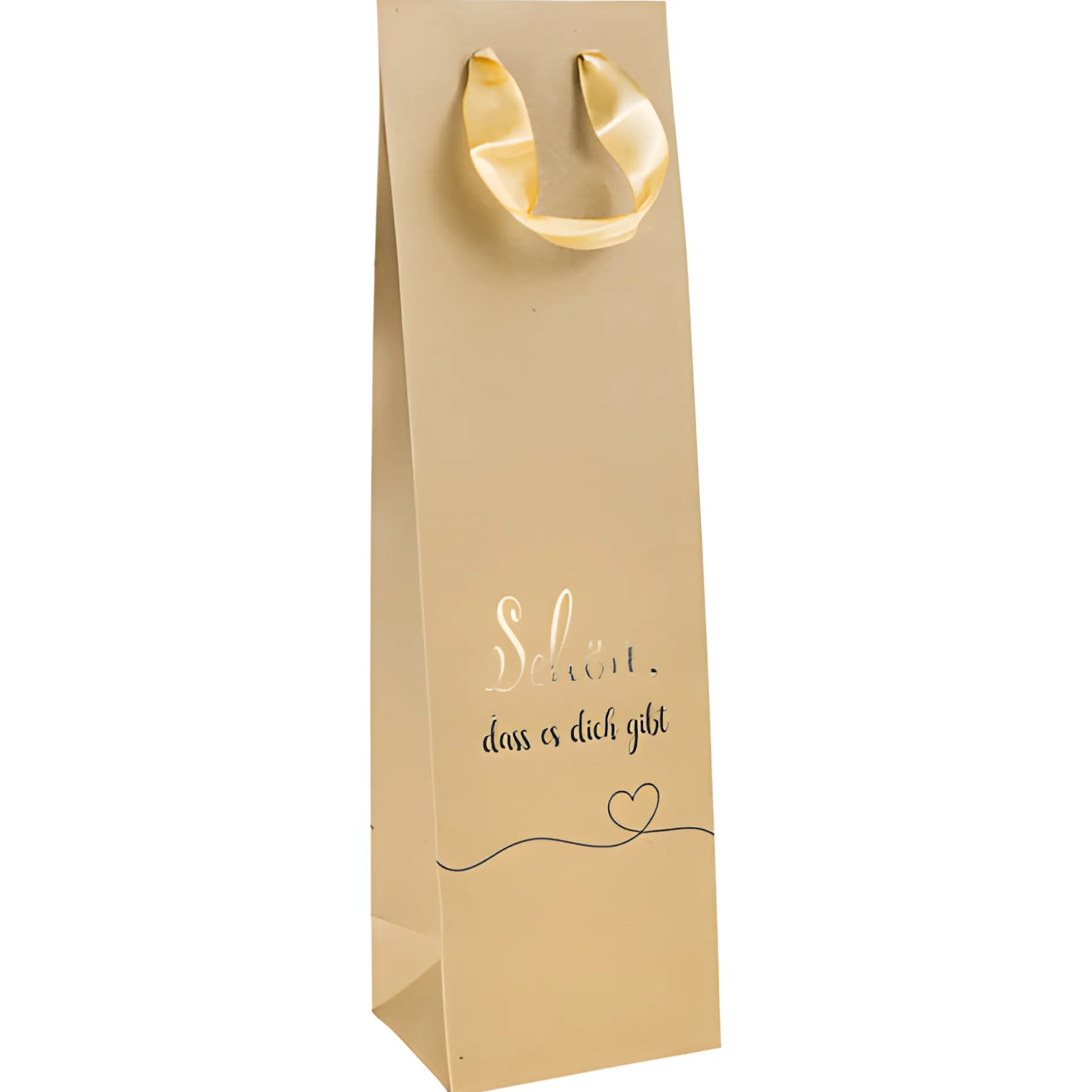Die hübsche Flaschentasche aus hellbraunem Kraftpapier ist genau die richtige für alle, die eine natürliche, neutrale und dennoch schmuckvolle Verpackung für ihre Geschenke bevorzugen. Sie hat ein elegantes, goldenes Satinband als kleinen Tragehenkel oder zum Verschließen und trägt den liebevollen Schriftzug ‚Schön, dass es dich gibt‘, begleitet von einem kleinen Herzen. Durch das Fehlen jeglicher anderen Motive wirkt diese Geschenkverpackung puristisch und edel und spricht den Beschenkten direkt an.