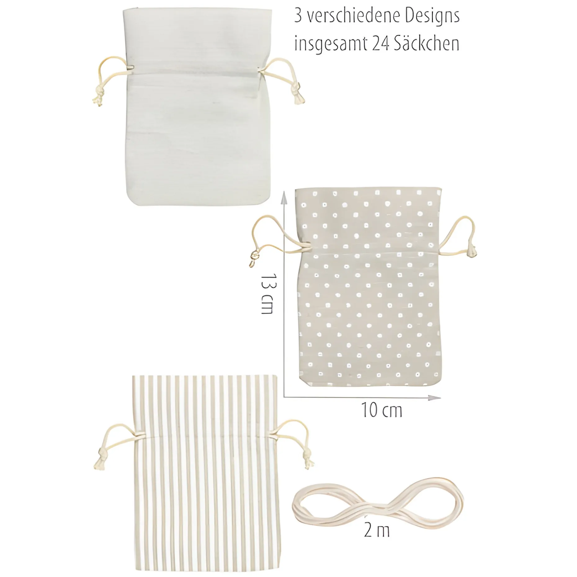 – 24 Beutel (60 % Baumwolle, 40 % Polyester) mit Zugband ca. 13 x 10 cm