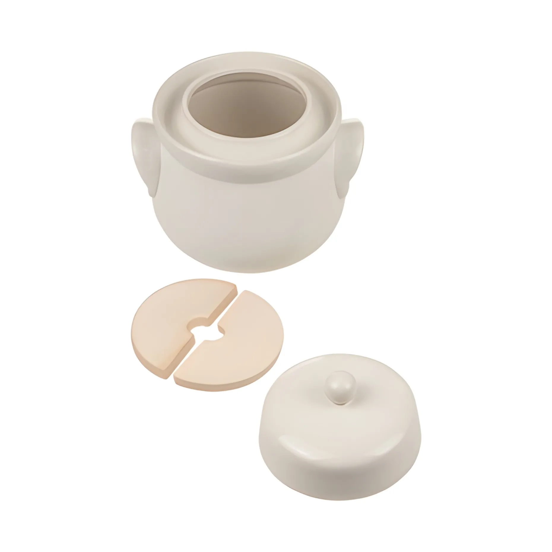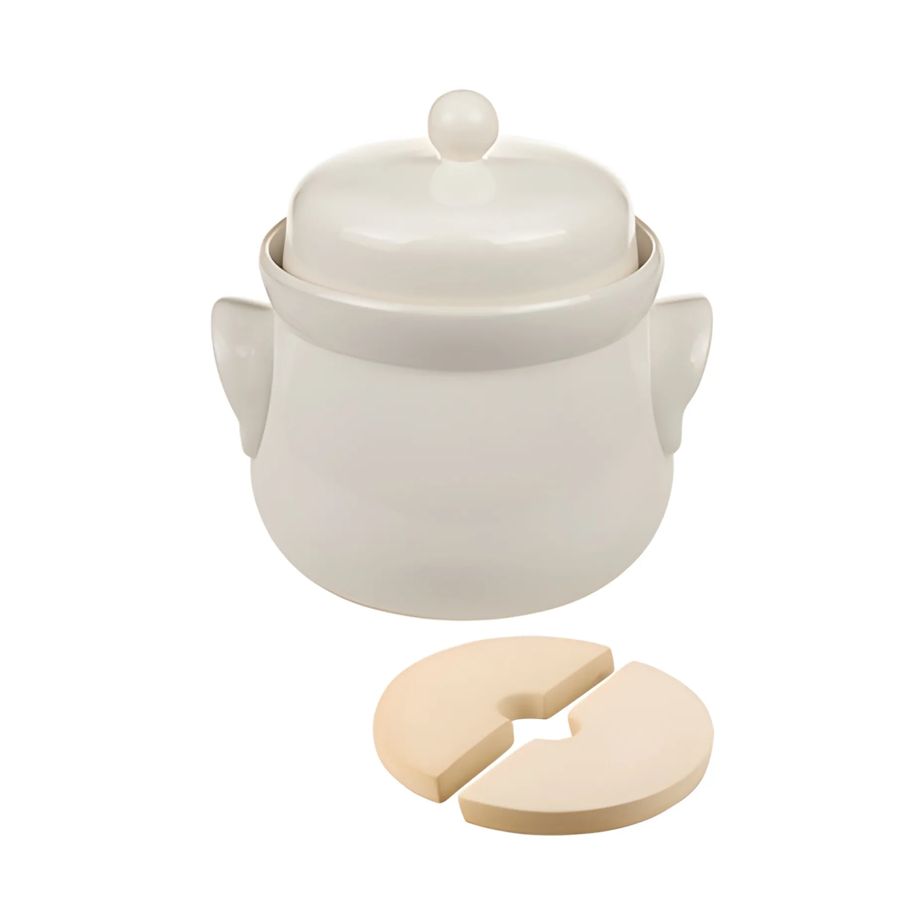 Mini-Gärtopf mit Deckel und Beschwerungssteinen zum Fermentieren. Der Sauerkrauttopf hat ein Fassungsvermögen von 2 Litern und ist aus cremefarbener Keramik. An der Öffnungsmündung des Topfes ist eine zusätzliche Vertiefung (Nut) angebracht, in die der Deckel eingesetzt wird. Mit dem passenden Deckel und den Fermentiersteinen haben Sie so alles zur Hand, um Sauerkraut, Kimchi und Salzgurken selbst herzustellen.