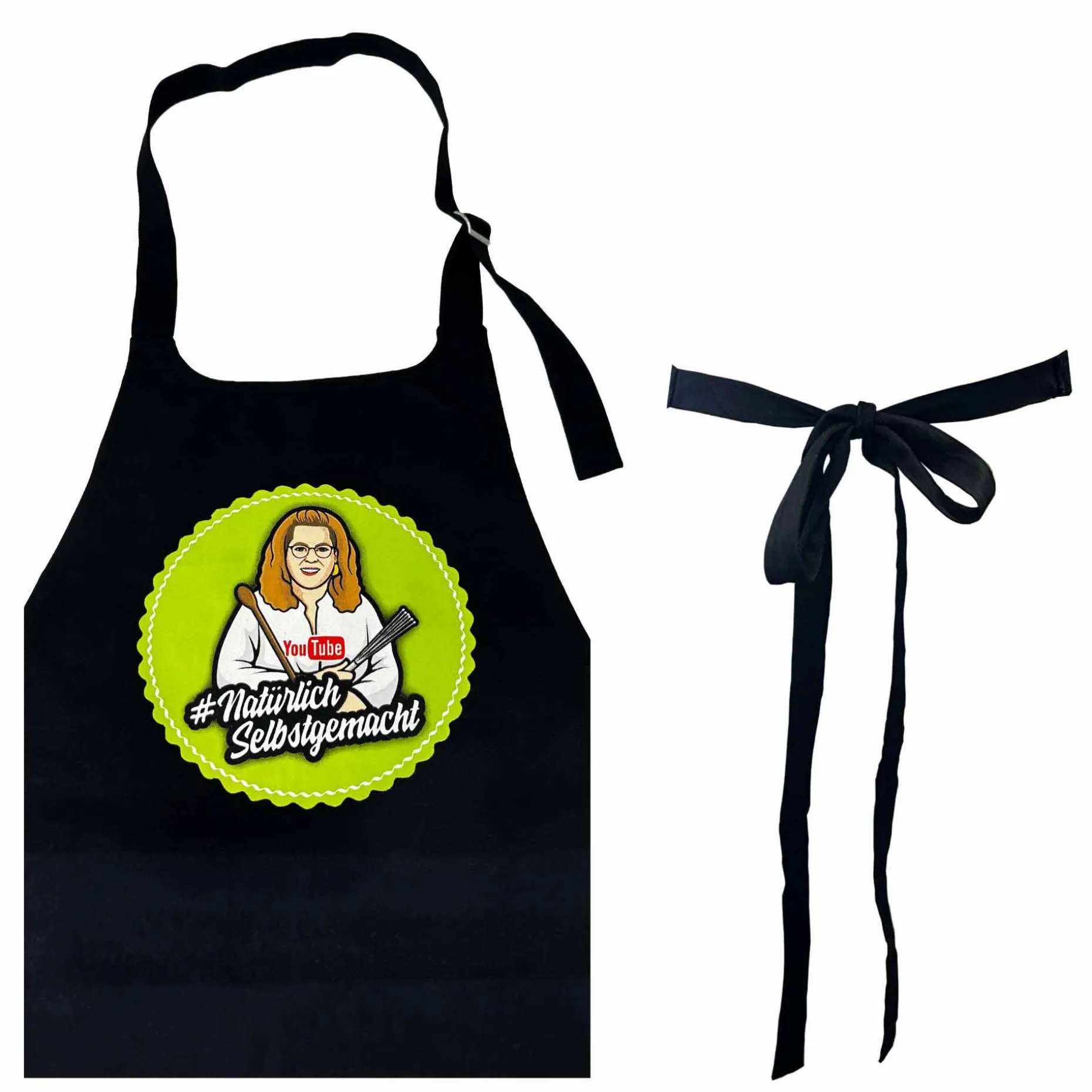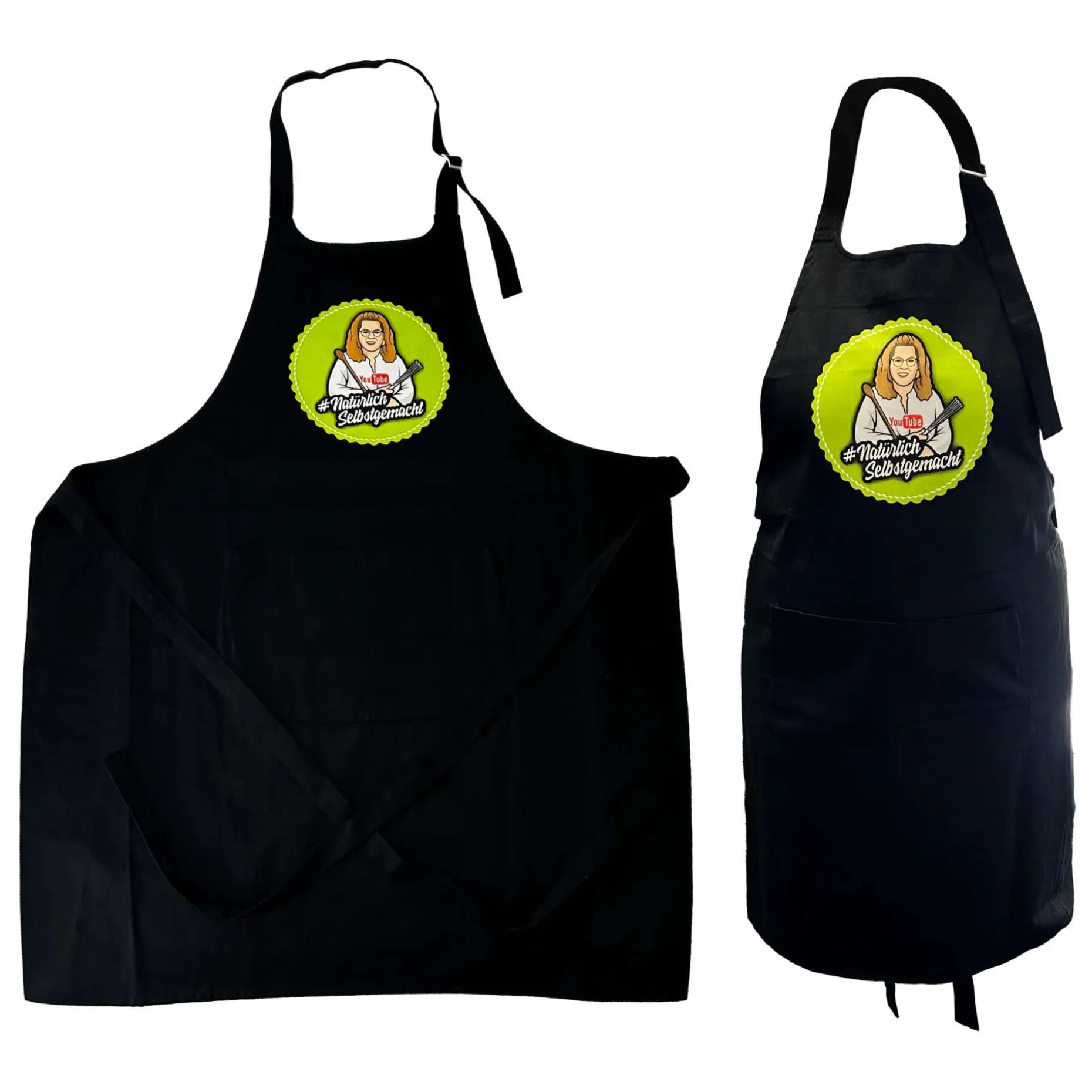 Die schwarze Profi-Schürze besteht aus 100 % Baumwolle mit einer festen Grammatur von 280 g/m². Sie ist robust, widerstandsfähig und pflegeleicht. Sie ist ideal für den Einsatz beim Kochen, Einkochen und Selbstmachen. In Brusthöhe ziert sie das ‚Natürlich Selbstgemacht‘-Logo im hochwertigen Druck, genauso wie in Gesas Videos.