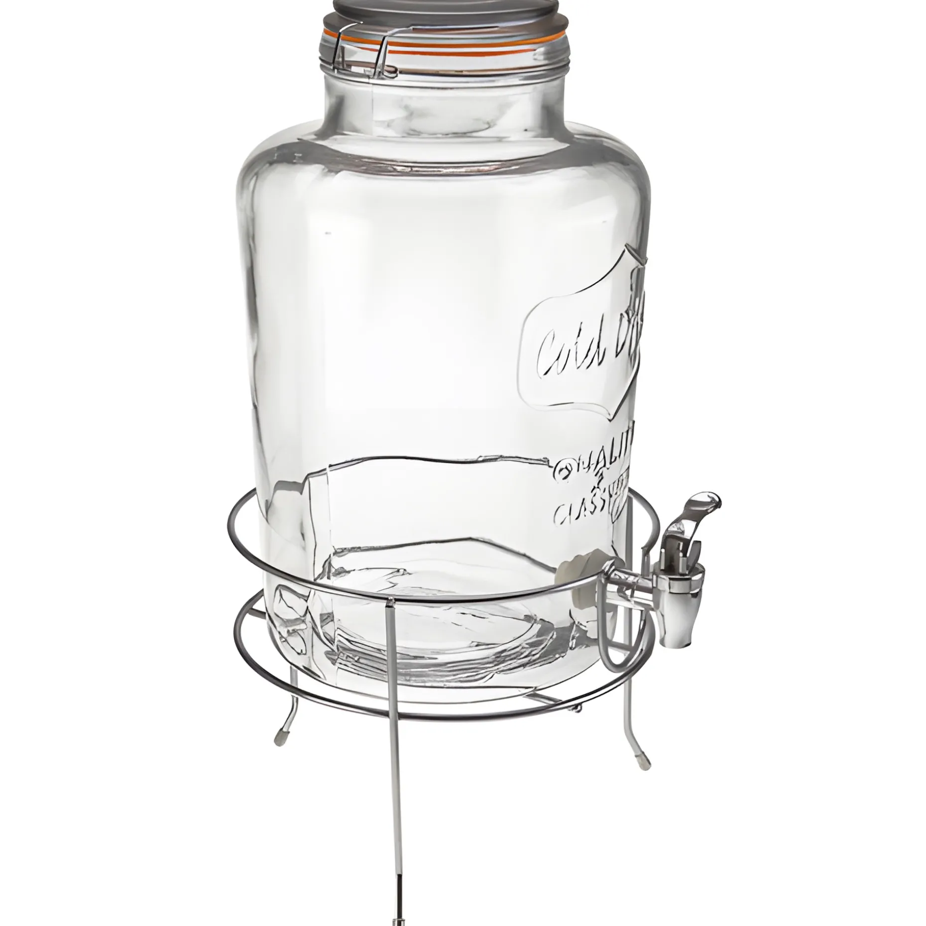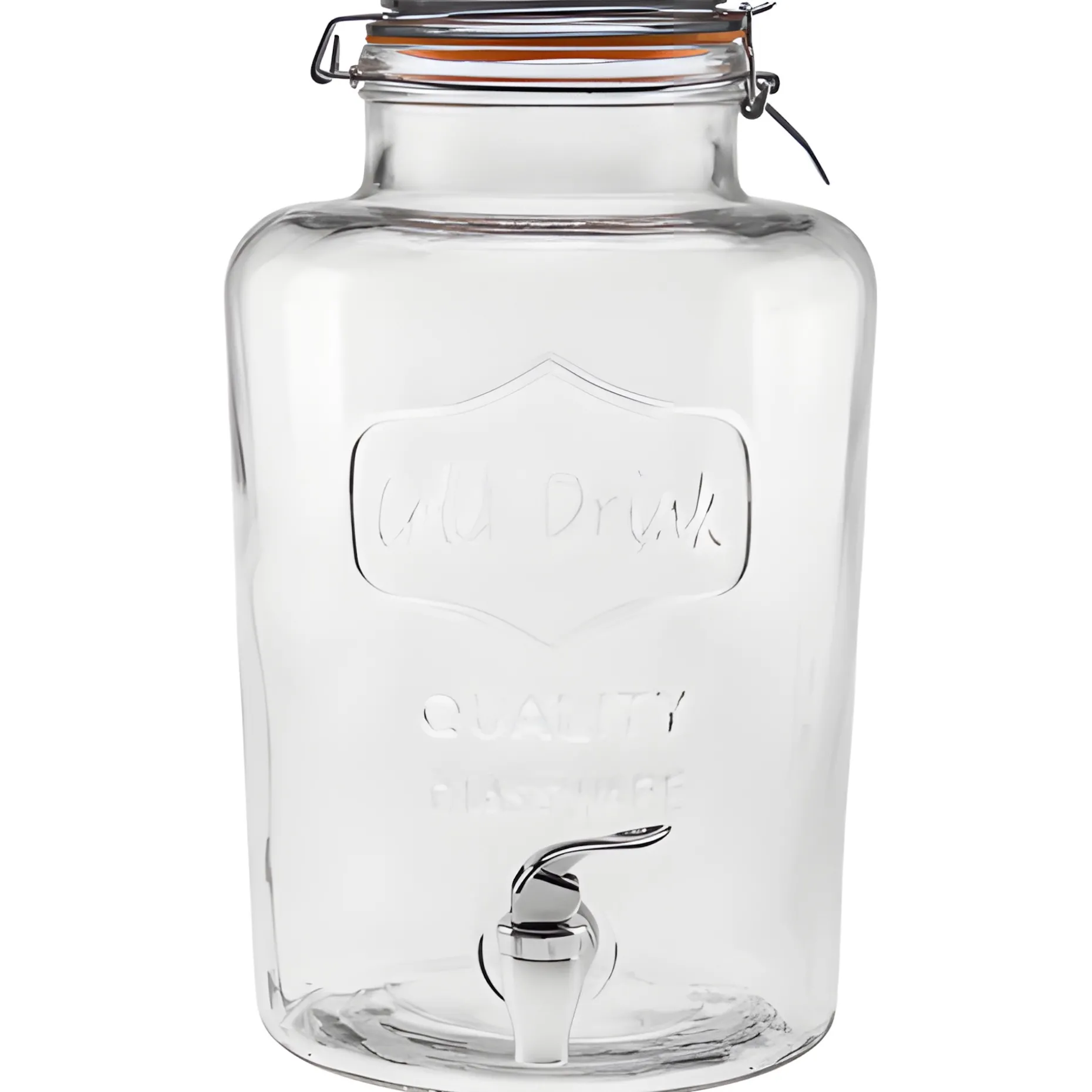 Ein Getränkespender für den großen Durst: Mit einem Fassungsvermögen von 8 Litern passt in diesen Limonadenspender genug hinein, um eine durstige Partygesellschaft zu versorgen. Die Öffnung wird mit einem Glasdeckel und einem Drahtbügel verschlossen. Der silberne Zapfhahn aus Kunststoff macht das Abfüllen von Saft, Limo, Eistee und Bowle kinderleicht. Die nostalgische Retro-Optik wird durch das Glasrelief auf der Vorderseite perfekt abgerundet. Ein Muss für die nächste Sommerparty!