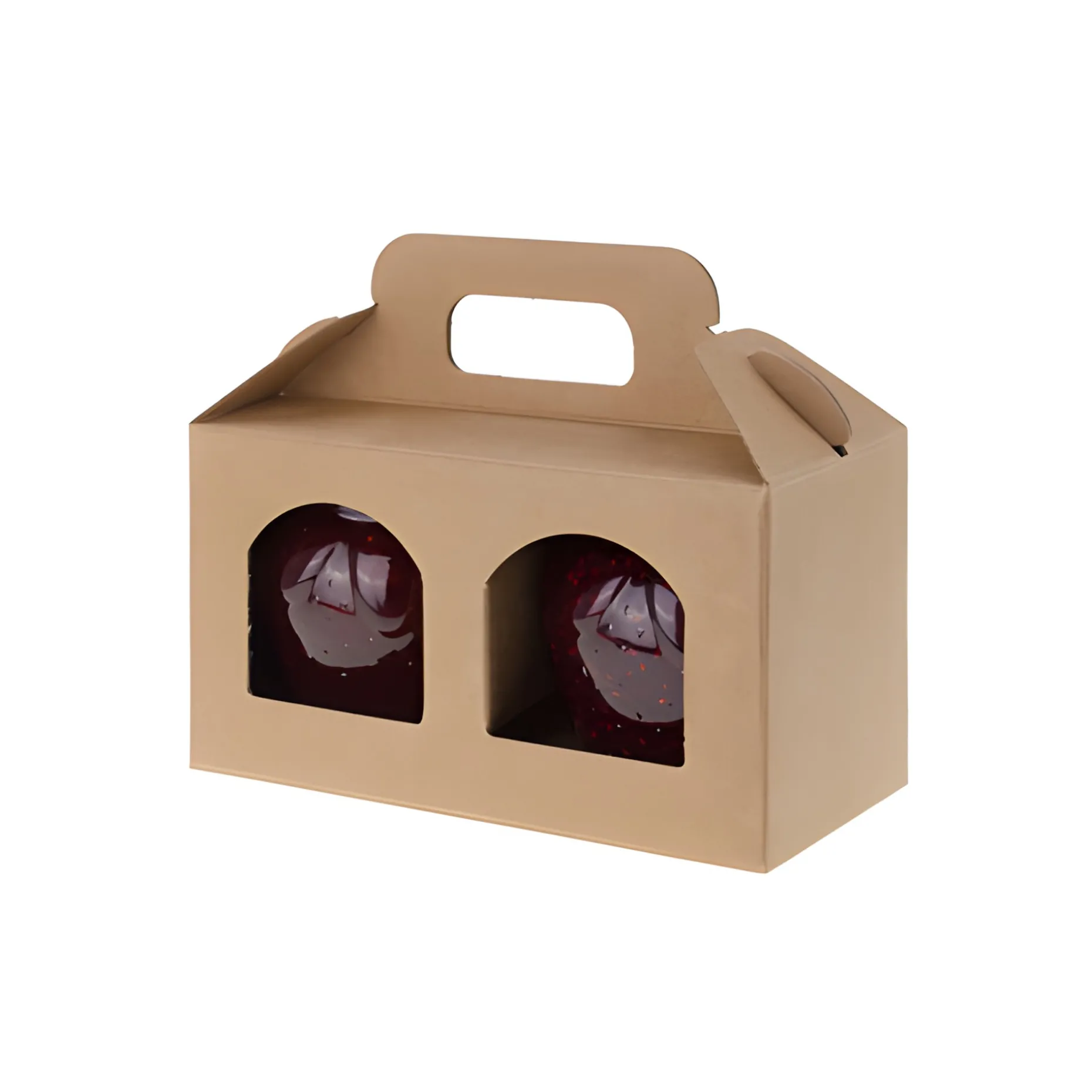 Kleiner Karton zur Aufbewahrung, Präsentation oder den Transport zweier mittelgroßer Gläser. Sichtfenster geben den Blick auf den Inhalt frei, die eingeklappten Laschen halten die Gläser an ihrem Platz und verhindern einen direkten Kontakt. Durch den pfiffigen Faltmechanismus ist der Karton in drei einfachen Schritten einsatzbereit, und der praktische Tragegriff erleichtert die Handhabung.
