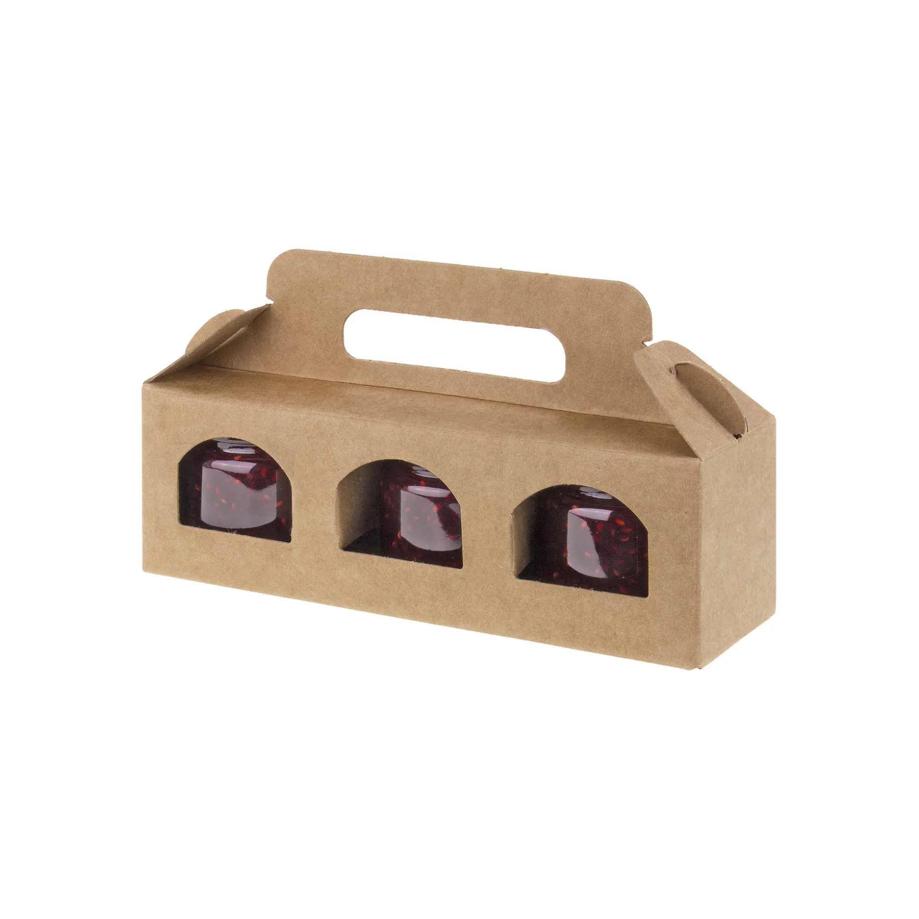 Kleiner Karton zur Aufbewahrung, Präsentation oder den Transport von drei kleinen Gläsern. Sichtfenster geben den Blick auf den Inhalt frei, die eingeklappten Laschen halten die Gläser an ihrem Platz und verhindern einen direkten Kontakt. Durch den pfiffigen Faltmechanismus ist der Karton in drei einfachen Schritten einsatzbereit, und der praktische Tragegriff erleichtert die Handhabung.