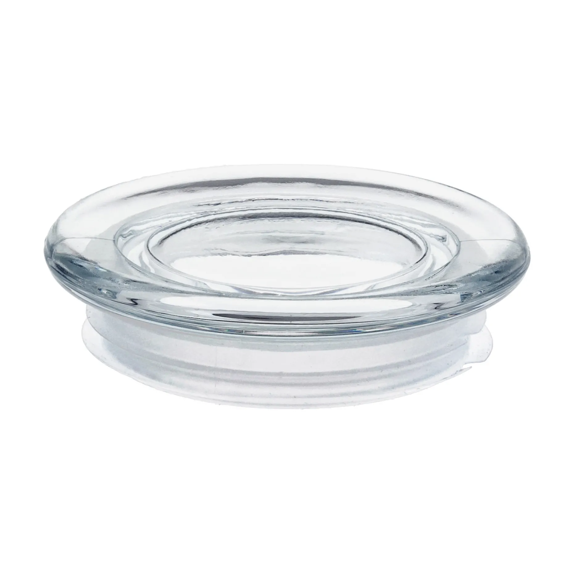 Flacher Stopfen aus Klarglas mit gerundeter Kante, der perfekt auf die Vorratsgläser der Serie ‚Kalle‘ passt sowie auf einige Gläser der Marke WECK mit einer Rundrand 80 Mündung und auf Gläser mit einem Öffnungsdurchmesser von ca. 75 mm. Der Glasverschluss hat eine Dichtung mit Kunststofflamellen.