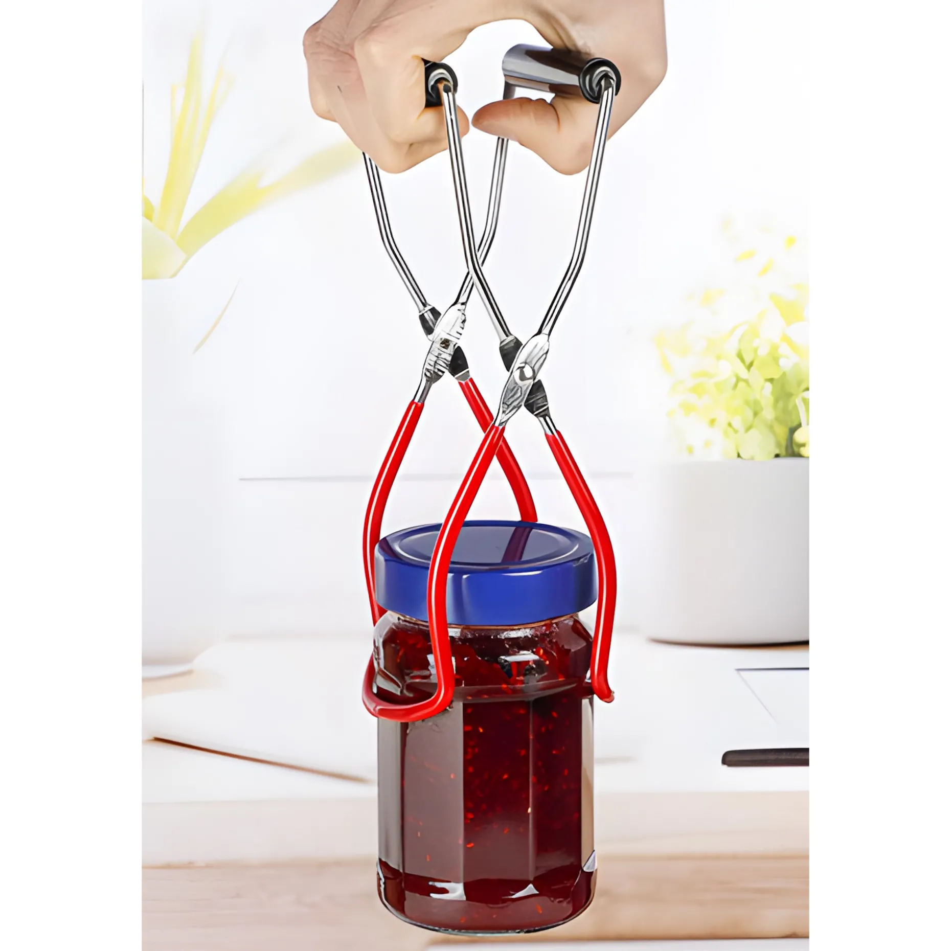 Beim Einkochen steht man oft vor dem Problem, wie man die heißen Gläser aus dem Topf oder Einkochautomaten holt, ohne sich zu verbrennen. Mit diesem praktischen Küchenhelfer können Sie Ihre Gläser mit eingekochten Suppen, Gemüse- und Fertiggerichten, Früchten wie auch Marmeladen einfach greifen und sicher aus dem Einkochtopf nehmen.