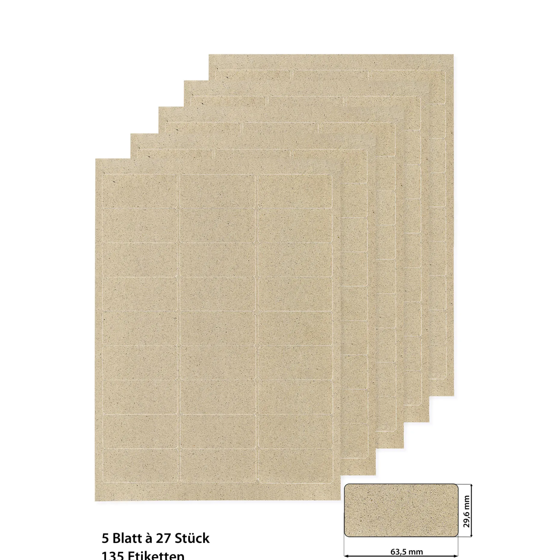 Das Einzeletikett hat ein Maß von ca. 63,5 x 29,67 mm. Es handelt sich um 5 Bögen DIN A4, insgesamt 135 Etiketten.