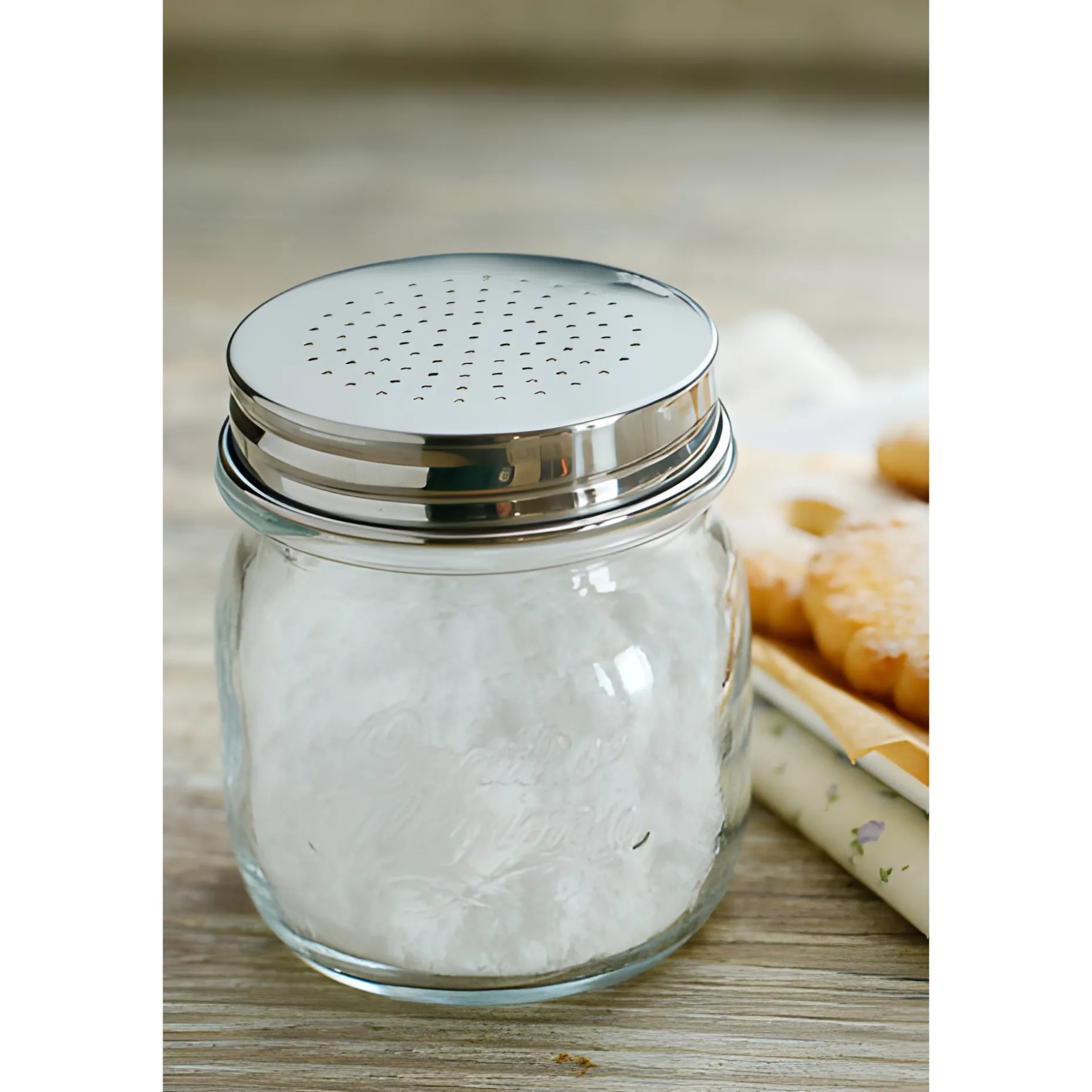 Der edle Deckel aus Edelstahl ist dank seiner kleinen Löcher ein praktischer Küchenhelfer, mit dem das Bestreuen einfach von der Hand geht. So können Sie Puderzucker aus dem Vorratsglas über Waffeln, Vanillekipferl oder Crêpes streuen. Oder beim Durchkneten eines Brotteiges, diesen mit einem Griff mit Mehl bestäuben, sodass dieser nicht klebt.
