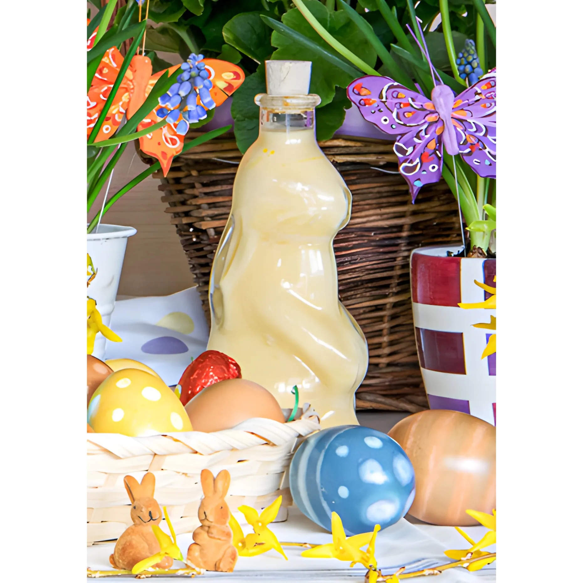Die originelle Schmuckflasche in Hasenform sollte nicht nur zu Ostern zum Einsatz kommen, denn sie kann das ganze Jahr über Freude bereiten. Die hübsche Flasche mit Korkmündung kann klassisch mit Eierlikör befüllt werden, eignet sich aber auch sehr gut für Sirup, Likör, Spirituosen oder auch Schokoladensoße.