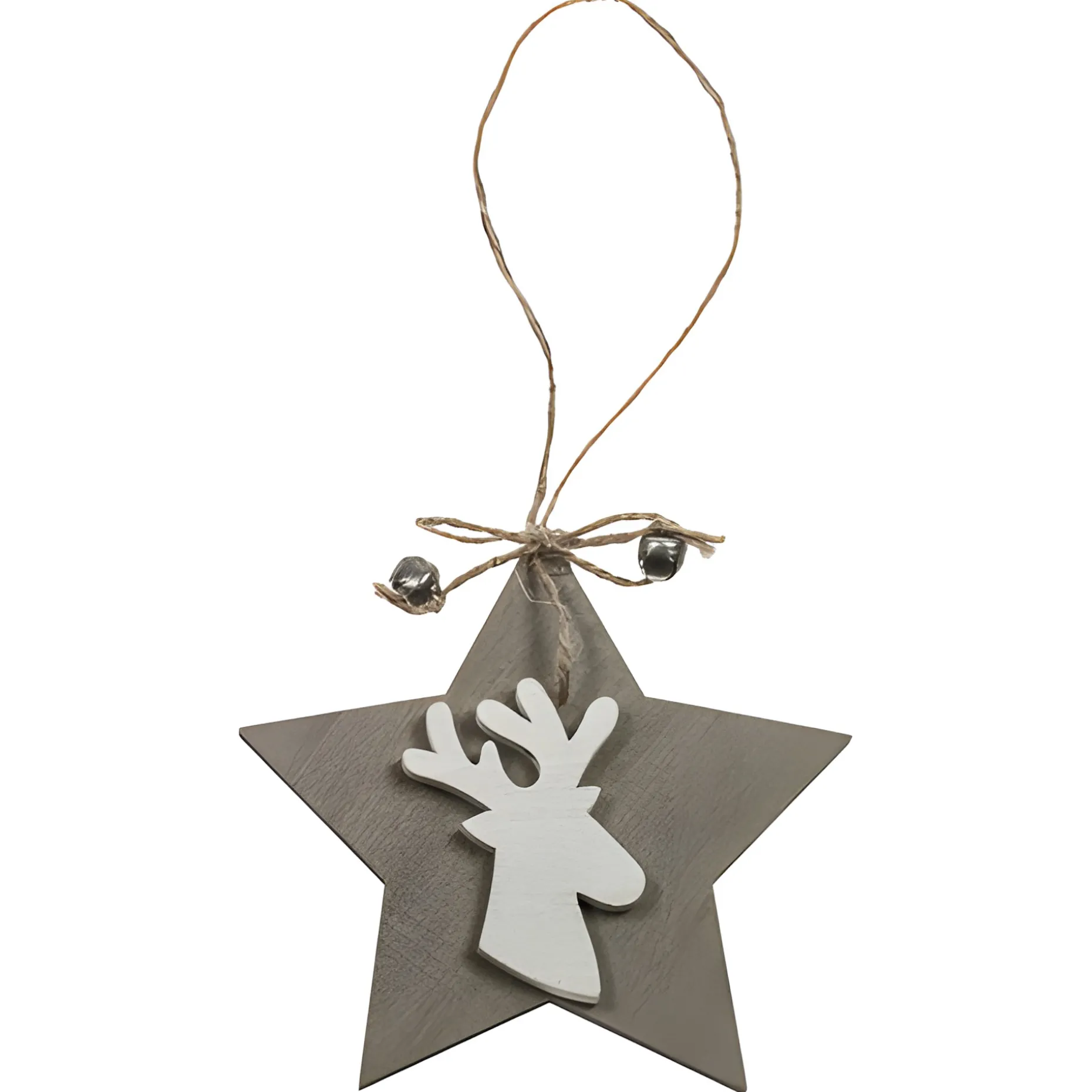 Sternförmiger Holz-Anhänger mit Elchkopf und Glöckchen.