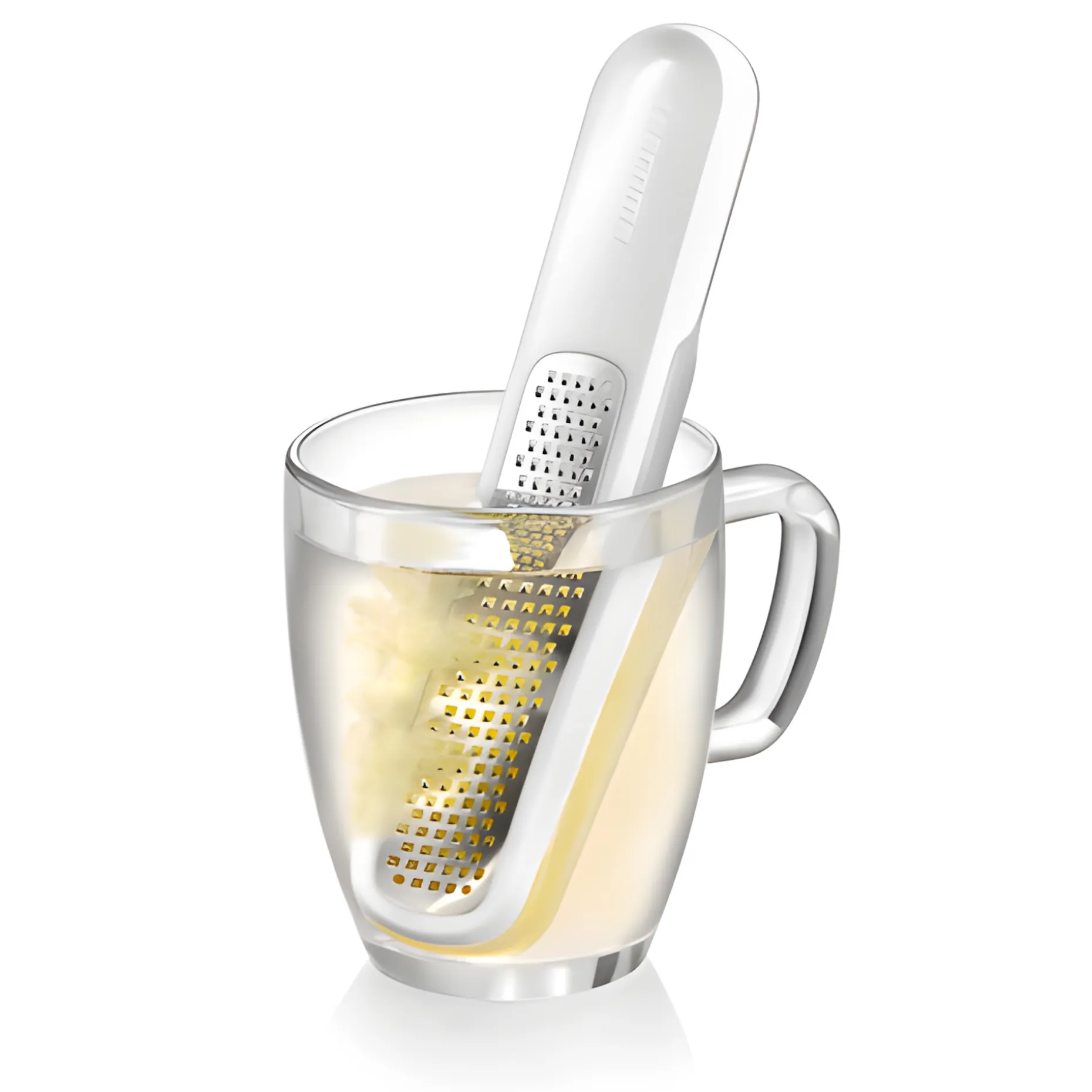 Besonders praktisch ist die Schutzabdeckung, die man zum Betätigen der Reibe auf ihre Rückseite schiebt. So kleckert oder tropft nichts daneben und der Abrieb wird aufgefangen. Nach dem Reibeprozess nimmt man die Schutzhülse ab und stellt die Reibe zum Zubereiten von Ingwertee in eine mit heißem Wasser gefüllte Glaskanne oder ein hohes Glas. Schon löst sich der Ingwerabrieb und verteilt sich im Wasser. Etwas ziehen lassen und schon haben Sie ein leckeres und gesundes Getränk, das Sie mit ein paar Spritzern Zitrone und etwas Honig verfeinern können.