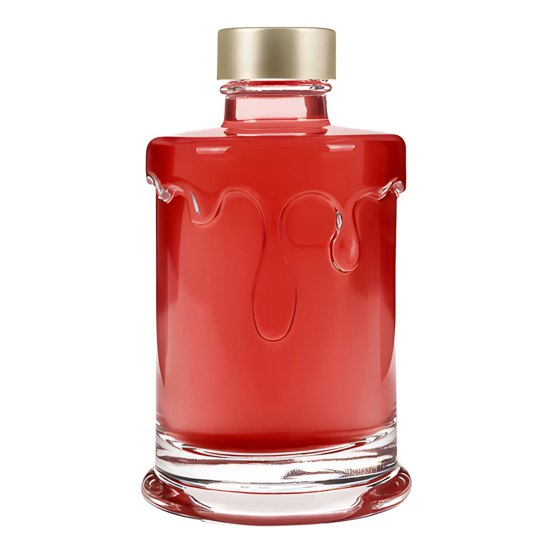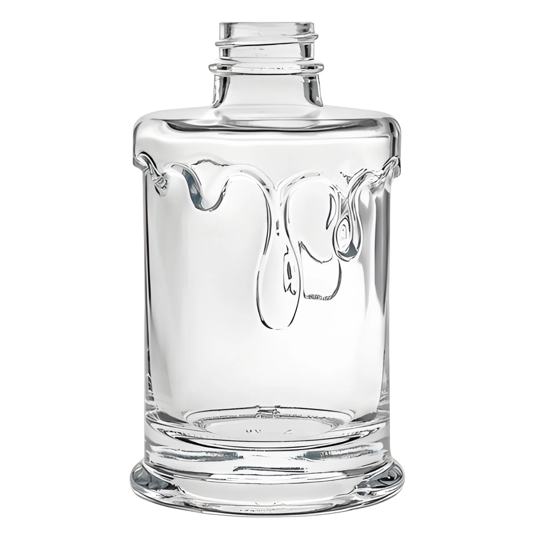 Die hübsche, runde Schmuckflasche mit kurzem Hals und schwerem Boden hat die Form einer kompakten Stumpenkerze und ist ideal zum Verschenken von selbstgemachtem Sirup und Likör. Der Clou dieser ausgefallenen Glasflasche ist die plastisch gestaltete Verzierung ihrer Oberfläche: Es sieht aus, als ob flüssiger Wachs an der Flasche herunterlaufen würde. Besonders schön kommt dieses Motiv zur Geltung, wenn die Flasche mit einem Inhalt in kräftigen Farben befüllt wird: z. B. mit rotem Granatapfelsirup oder goldgelbem Orangenlikör. Die Flasche hat eine GPI-Mündung für einen entsprechenden Schraubdeckel, wodurch sie sich luftdicht und auslaufsicher verschließen und prima transportieren lässt. Durch den schweren Boden hat sie einen sicheren, stabilen Stand.