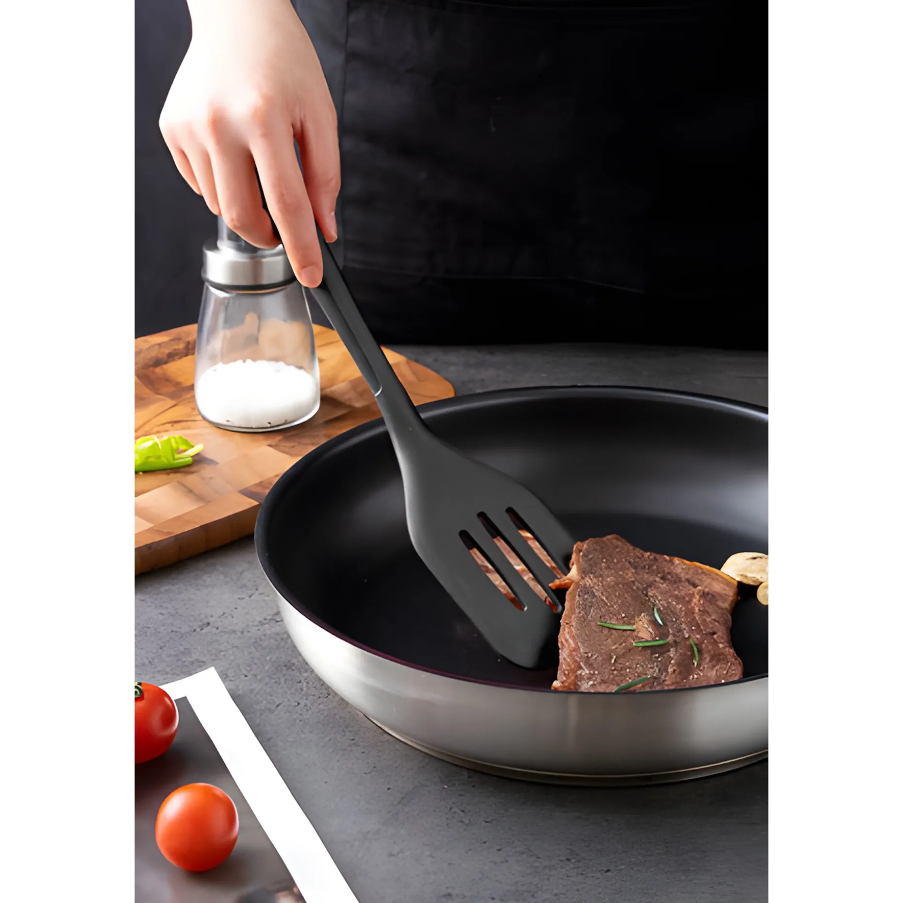 Die drei Schlitze des Silikonspatels verhindern, dass ungewollt größere Mengen an Fond oder Bratfett aus der Pfanne genommen werden, und bieten zusätzliche Flexibilität. Das lebensmittelechte Silikon ermöglicht es, den Schlitzspatel ohne Bedenken im Topf oder in der Pfanne liegen zu lassen, ohne dass man sich am Griff verbrennt. Der Griff hat ein Loch, an dem man den Flex-Wender in Anthrazit aufhängen kann, um ihn immer schnell zur Hand zu haben.