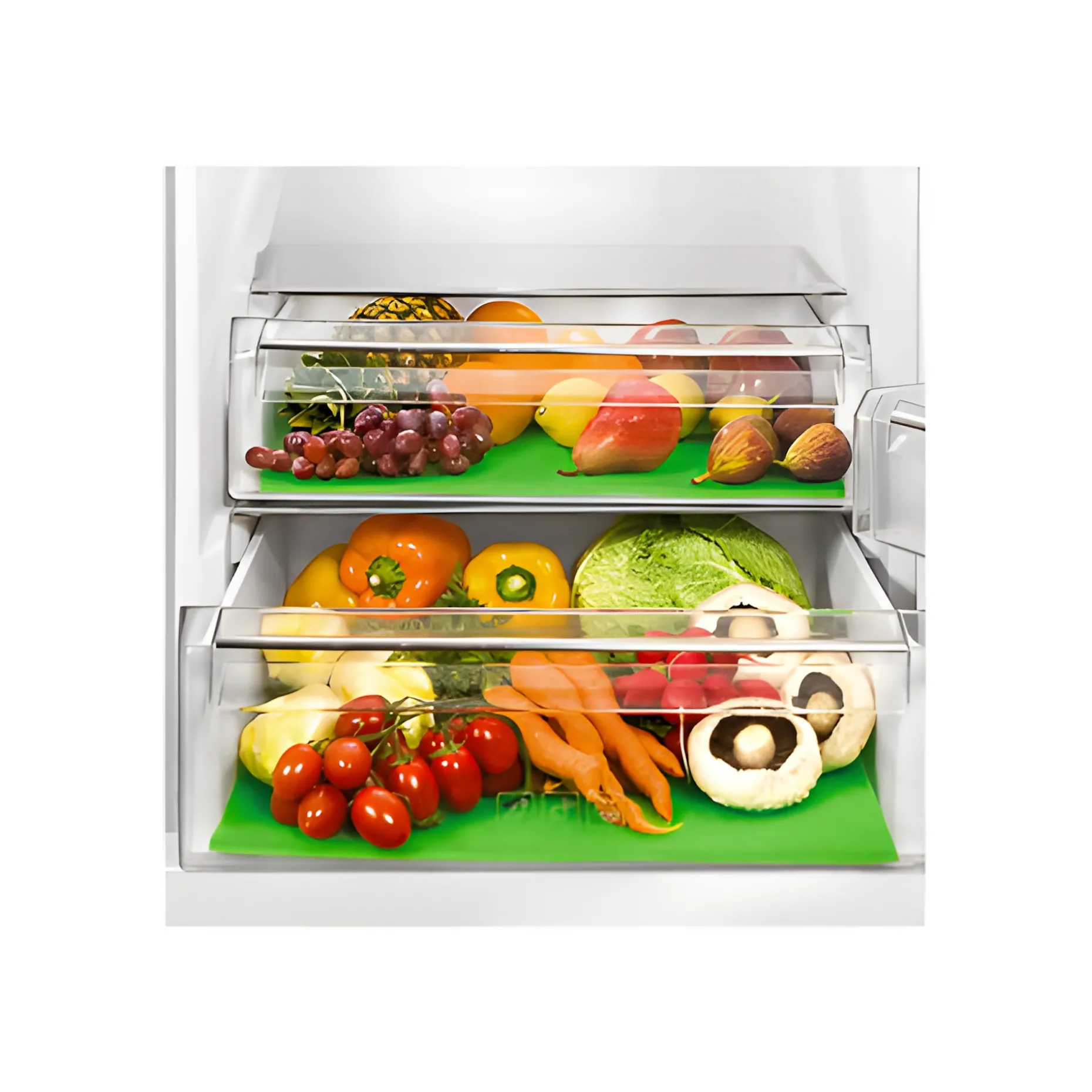 Die Kühlschrankmatte sorgt durch ihre Oberfläche für eine gute Luftzirkulation im Kühlschrank und wirkt auf der Unterseite feuchtigkeitsabsorbierend. Obst und Gemüse bleibt dadurch länger frisch und bekommt durch die weiche Unterlage keine Druckstellen.