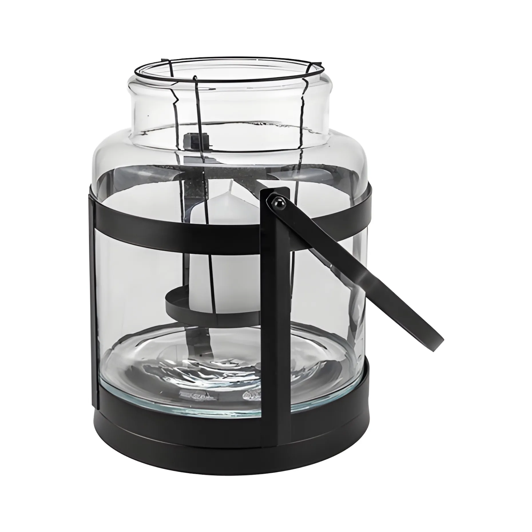 Dekoratives Laternen-Windlichtglas für Teelichter, Stumpenkerzen und LED-Leuchten. Das große Teelichtglas ist in eine schwarze Metall-Konstruktion mit einsetzbarer Kerzenhalterung eingelassen. Mit dem geschwungenen Griff kann das Glas überall hingestellt werden, wo es zu einem schönen Dekoelement wird. So haben Sie das ideale Windlicht, das im Wohnzimmer, auf der Terrasse, dem Balkon und im Garten eine tolle Figur macht.