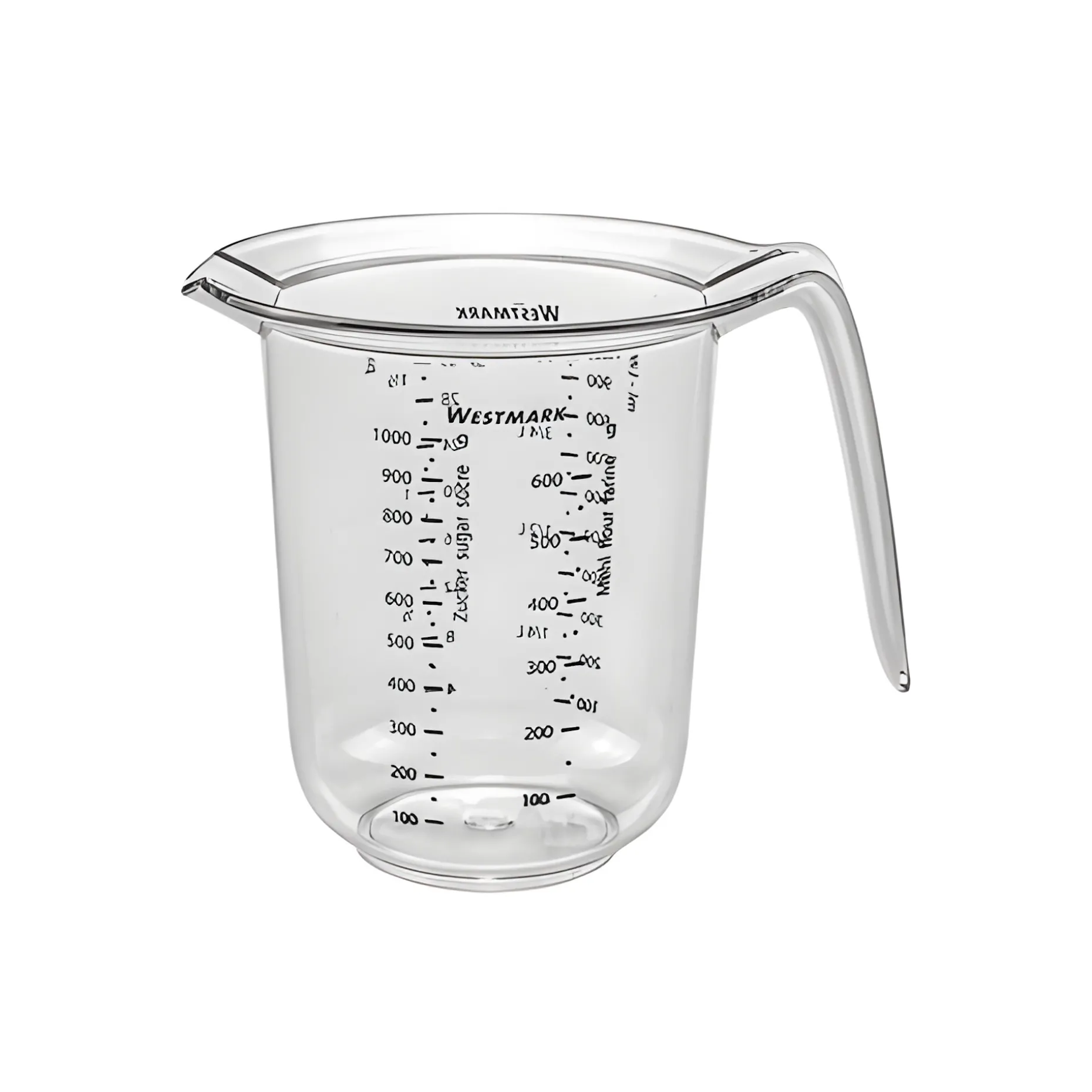 Durchsichtiger Messbecher mit aufgedruckten Skalen für Liter, ml, fl.oz, pints, Mehl und Zucker.