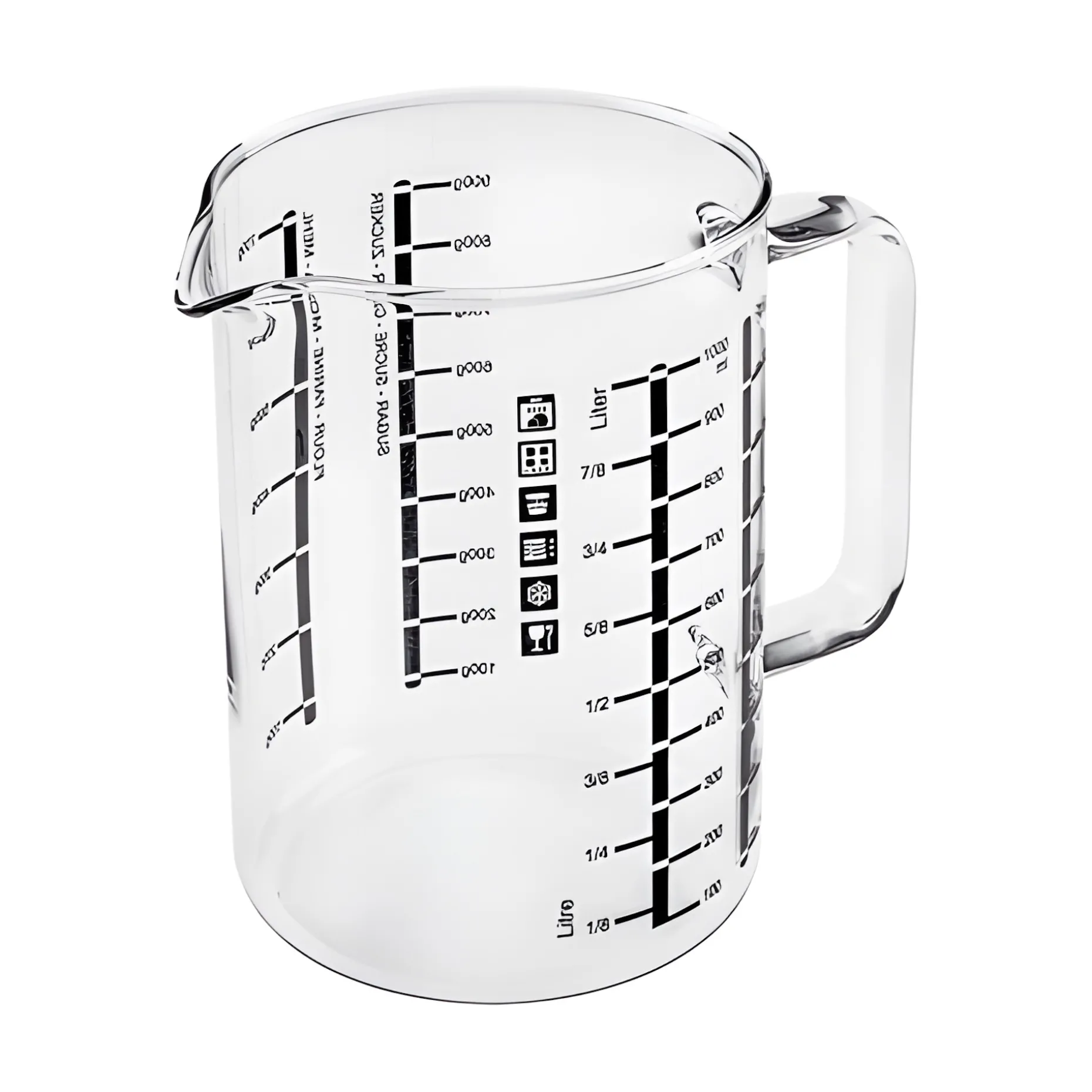 Hochwertige moderne Messkanne aus hitzebeständigem Borosilikatglas, die sich perfekt für die Abfüllung von Konfitüren und Gelees eignet. Auf dem schönen Glasbehälter mit Griff sind aufgedruckte Skalen für Liter- und Milliliterangaben, Mehl und Zucker sowie eine Skala für Ounces (OZ) vorhanden. Der gradlinige Krug kann für kalte und heiße Inhalte verwendet werden, ist lebensmittelecht und spülmaschinengeeignet.