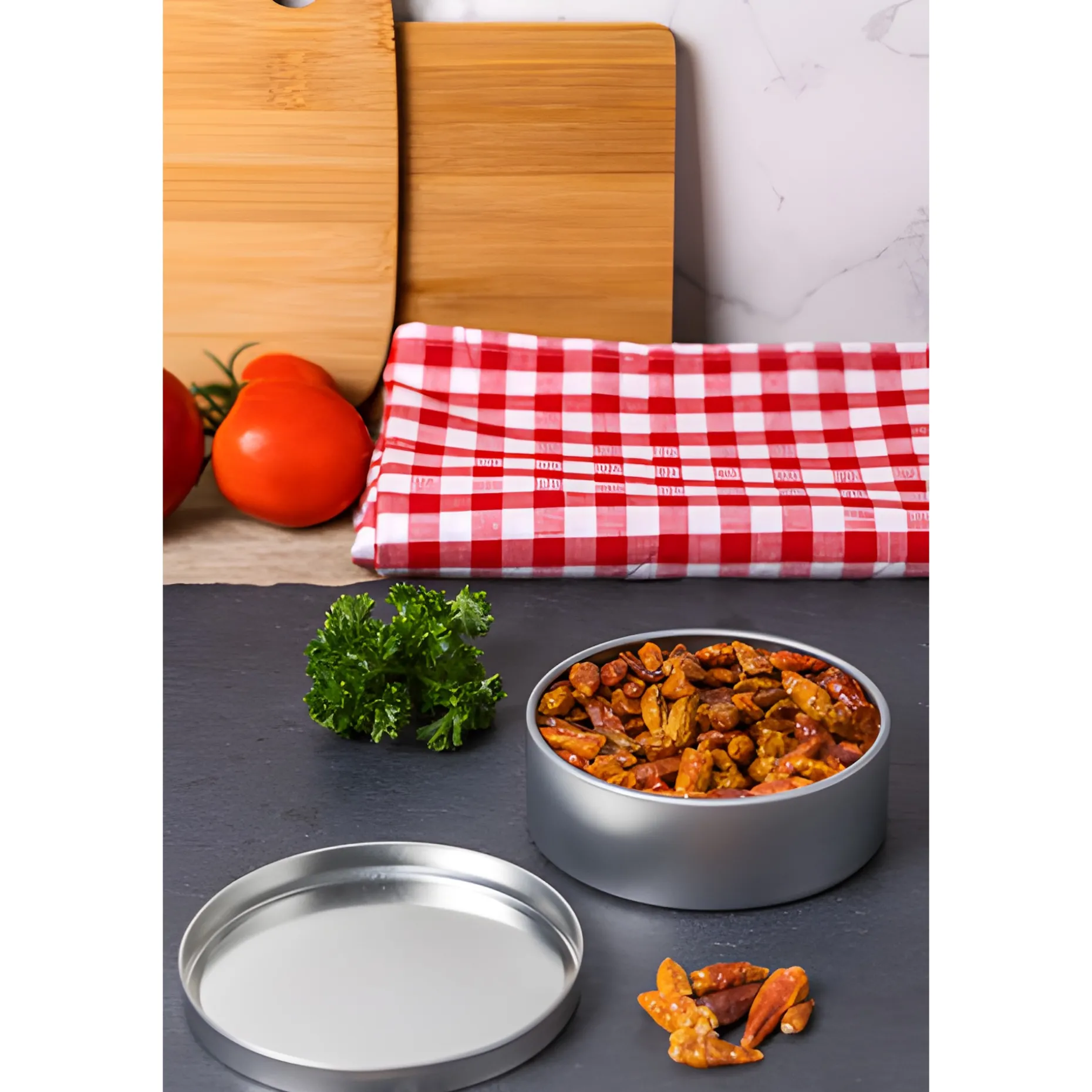 Silberne Metalldose mit Deckel im 6er Pack zur idealen Aufbewahrung von Süßigkeiten und Gewürzen. Die leichte Bonbondose aus Weißblech ist lebensmittelgeeignet und prima für selbstgemachte Drops, getrocknete Früchte oder leckerer Schokolade zum Naschen. Als originelle Gewürzdose verwendet, finden auch frische Gartenkräuter hier Platz und werden lichtgeschützt und getrocknet gelagert. Durch ihre Form sind die flachen Dosen prima stapelbar und passen so platzsparend ins Regal. Als Geschenk oder kleines Mitbringsel kann die Dose ebenfalls verwendet werden – einfach mit einem schönen Etikett und einer Schleife verzieren und fertig ist die Aufmerksamkeit.