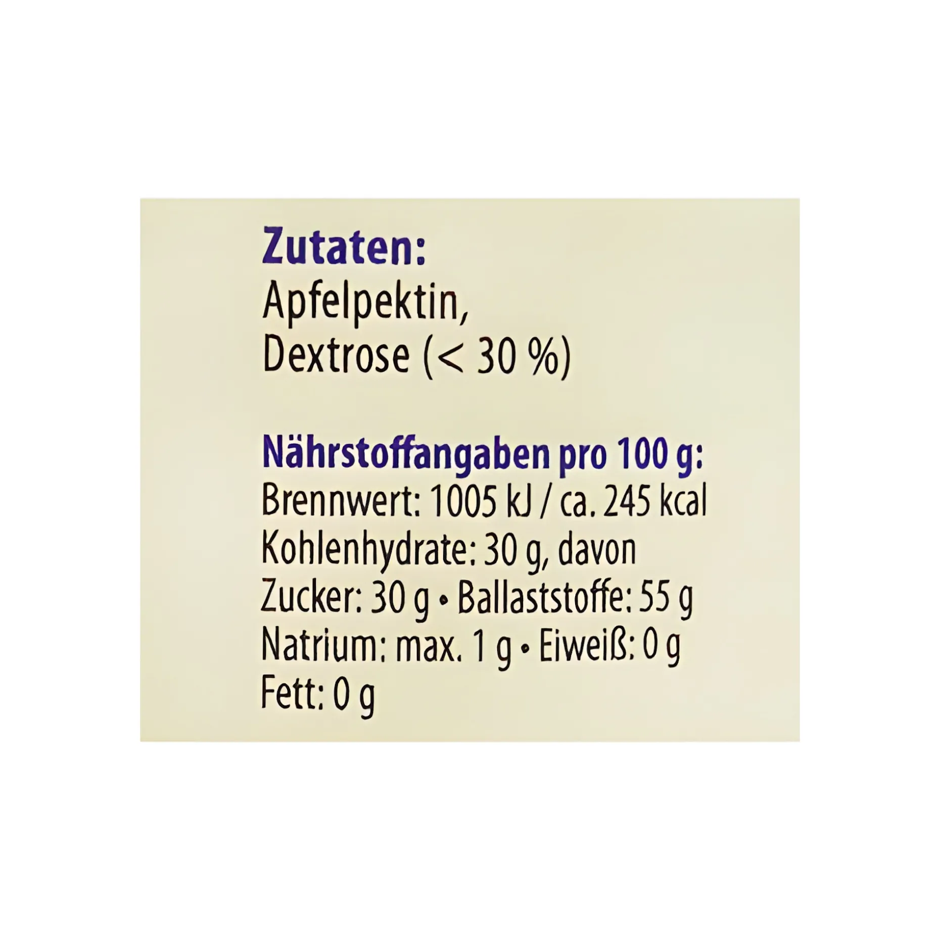 Dieses Pektin besteht nur aus Apfelpektin und Dextrose (höchstens 30 %, um eine gleichbleibende Reaktionsfähigkeit des natürlichen Pektins zu erreichen). Es beinhaltet keine zusätzliche Säure und so kann man selbst bestimmen, welche Säure man verwenden möchte (manche vertragen keine Zitronensäure und verwenden somit Zitronensaft). Zudem kann man, je nach Pektingehalt der Früchte mehr oder weniger Pektin verwenden. Auch mit der Zuckermenge ist man variabel, denn das Pektin geliert sowohl bei 2:1 als auch bei 3:1. Außerdem beinhaltet das Pektin keine Konservierungsstoffe.