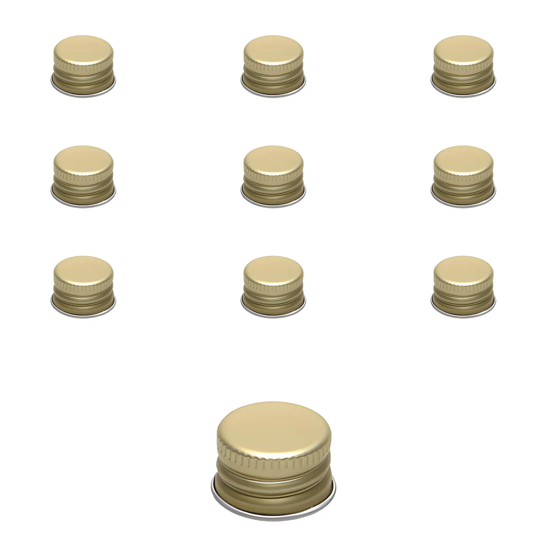 Der goldfarbene Schraubverschluss aus Aluminium mit Rollrand im praktischen 10er-Pack passt auf alle Schraubflaschen mit einer PP 18-Mündung, z. B. auf kleine Probierflaschen wie die Kropfhalsflasche 40 ml, die Taschenflasche 20 ml oder die Geradhalsflasche 50 ml.