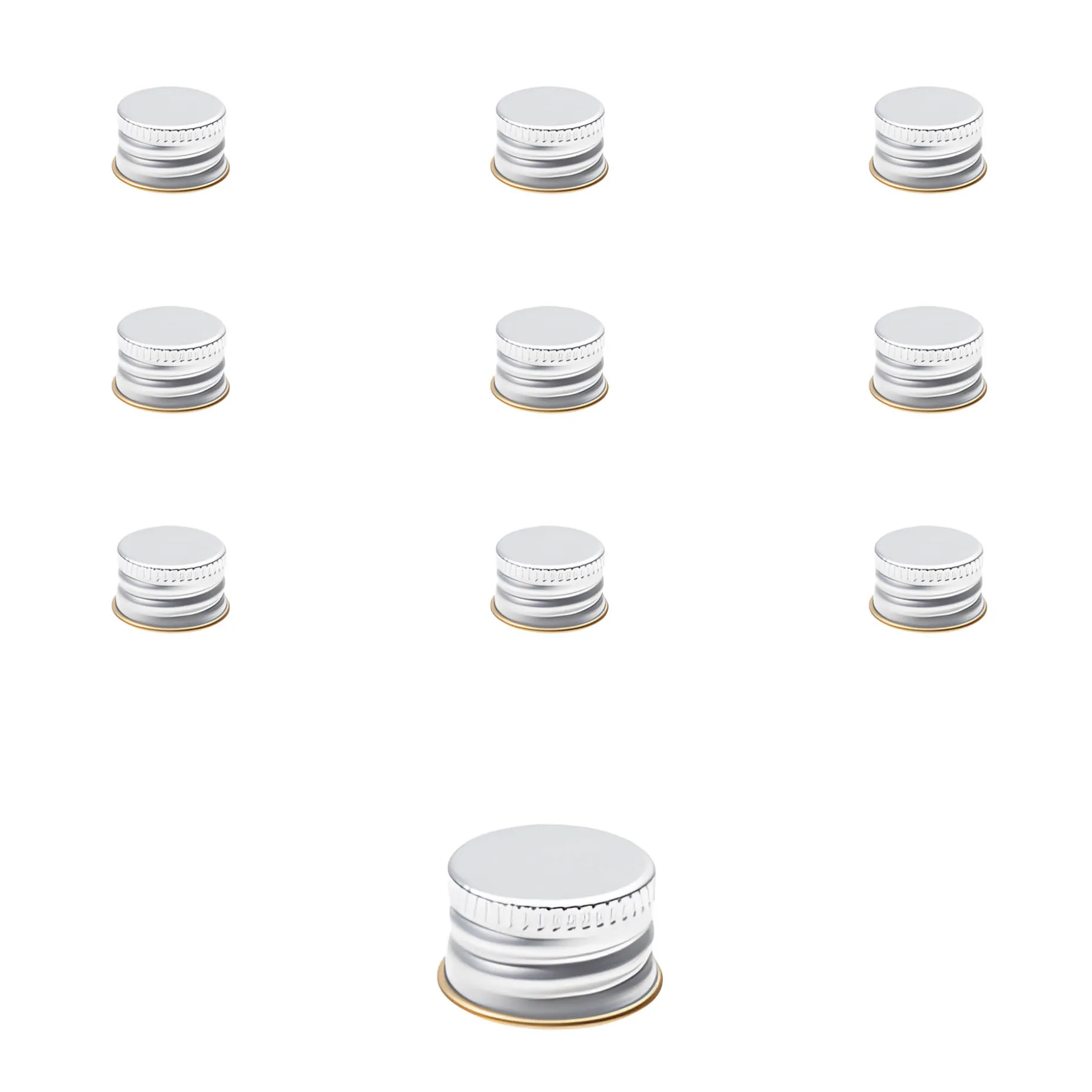 Der silberfarbene Schraubverschluss aus Aluminium mit Rollrand im praktischen 10er-Pack passt auf alle Schraubflaschen mit einer PP 18-Mündung, z. B. auf kleine Probierflaschen wie die Kropfhalsflasche 40 ml, die Taschenflasche 20 ml oder die Geradhalsflasche 50 ml.