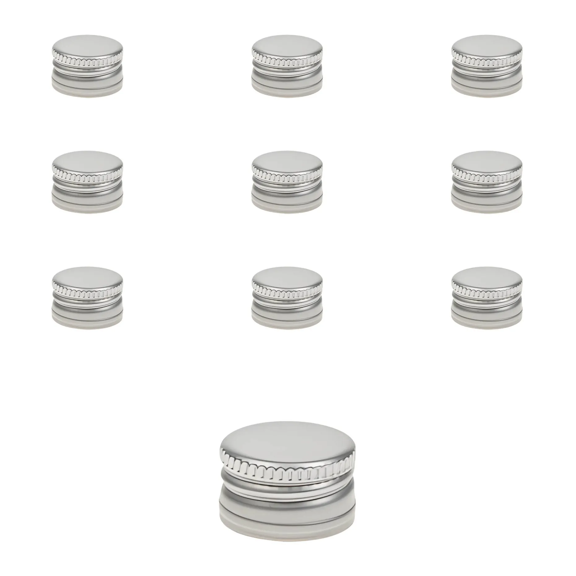 Der silberfarbene Schraubverschluss aus Aluminium ohne Rollrand im praktischen 10er-Pack passt auf alle Schraubflaschen mit einer PP 18-Mündung, z. B. auf kleine Probierflaschen wie die Kropfhalsflasche 40 ml, die Taschenflasche 20 ml oder die Geradhalsflasche 50 ml.