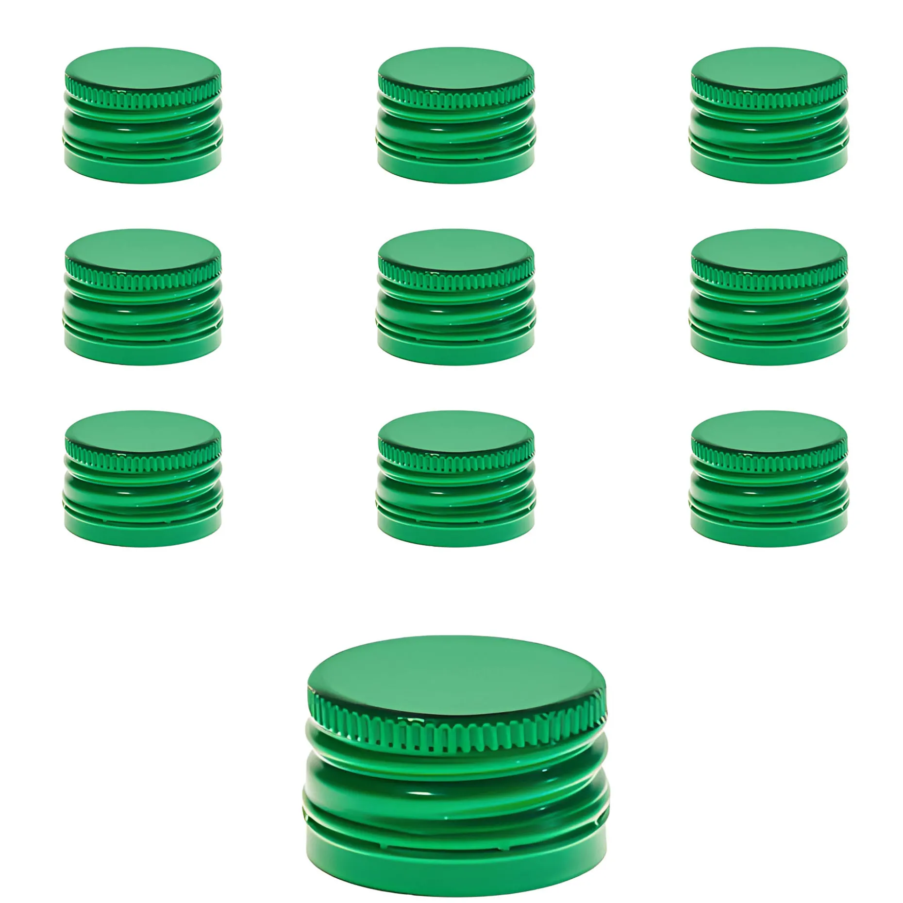 Der grüne Schraubverschluss aus Aluminium im praktischen 10er-Pack passt auf alle Schraubflaschen mit einer PP 28-Mündung, z. B. auf Geradhalsflaschen (ab 200 ml), die Pinta 350 ml und 500 ml SV und die Taschenflaschen (ab 100 ml). Er hat einen Originalitätsring zur Versiegelung.