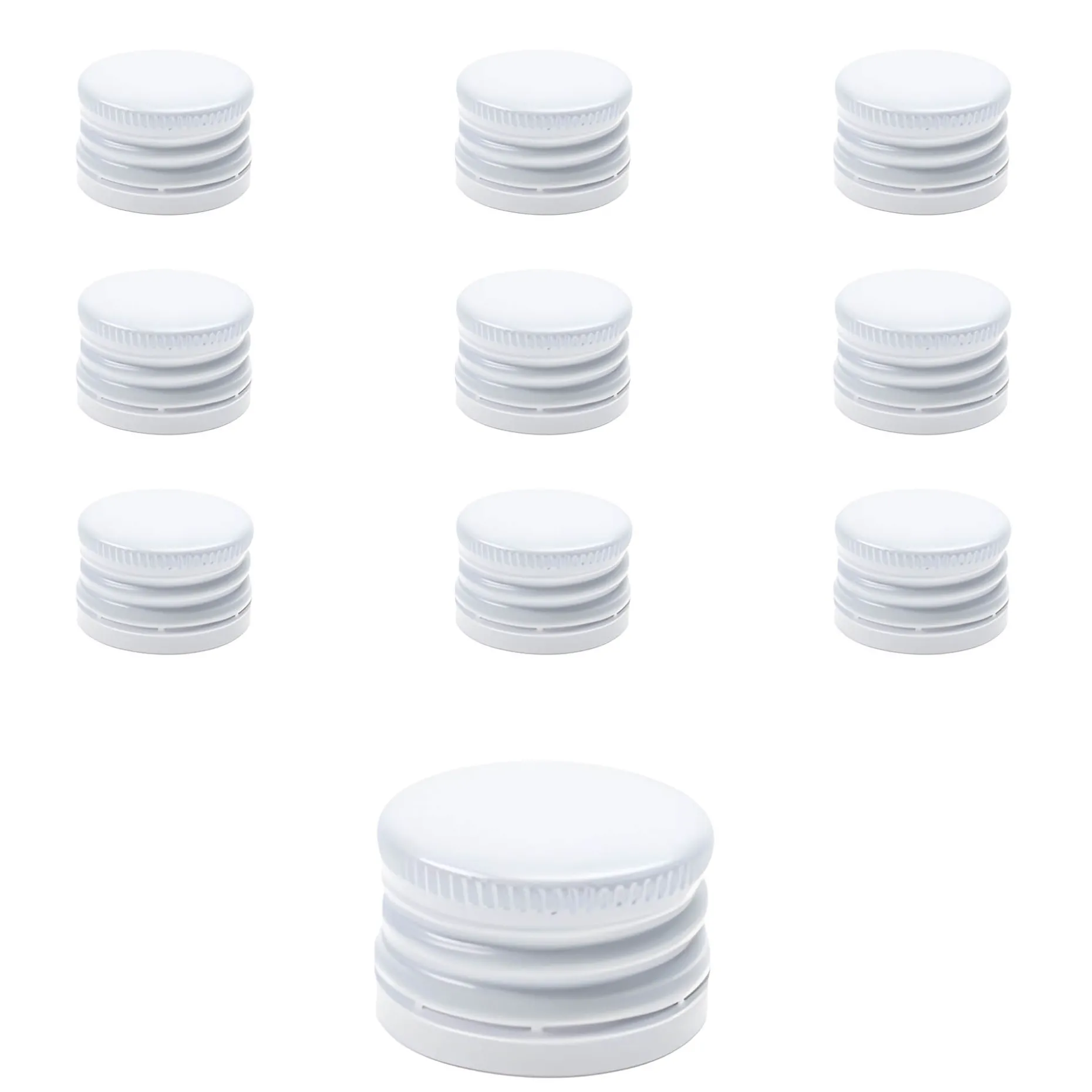 Der weiße Schraubverschluss aus Aluminium im praktischen 10er-Pack passt auf alle Schraubflaschen mit einer PP 28-Mündung, z. B. auf Geradhalsflaschen (ab 200 ml), die Pinta 350 ml und 500 ml SV und die Taschenflaschen (ab 100 ml). Er hat einen Originalitätsring zur Versiegelung.