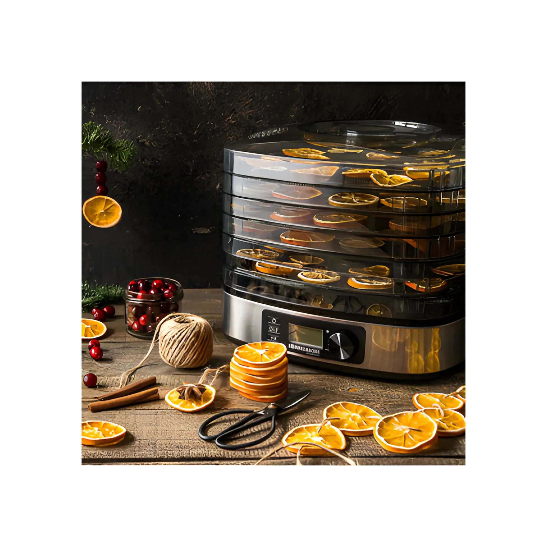 Hochwertiger Dörrautomat zum Trocknen von Obst, Gemüse, Kräutern oder Fleisch. Mit diesem Gerät dörren Sie auf schonende Weise selbst geerntete Früchte, frisches Gemüse und können leckeres Dörrfleisch oder Fruchtleder selbst herstellen. Ein großer Ventilator verteilt die Wärme dabei gleichmäßig im Inneren, die gute Isolation sorgt für einen geringen Energieverbrauch und der Automat ist dabei sehr leise. Die 5 Dörretagen sind mit feinmaschigen Gittern aus hygienischem Edelstahl ausgestattet und sogar höhenverstellbar. Mit den beiliegenden Müsliriegel-Formen können zu den gesunden Snacks auch eigene Powerriegel ganz einfach kreiert werden.