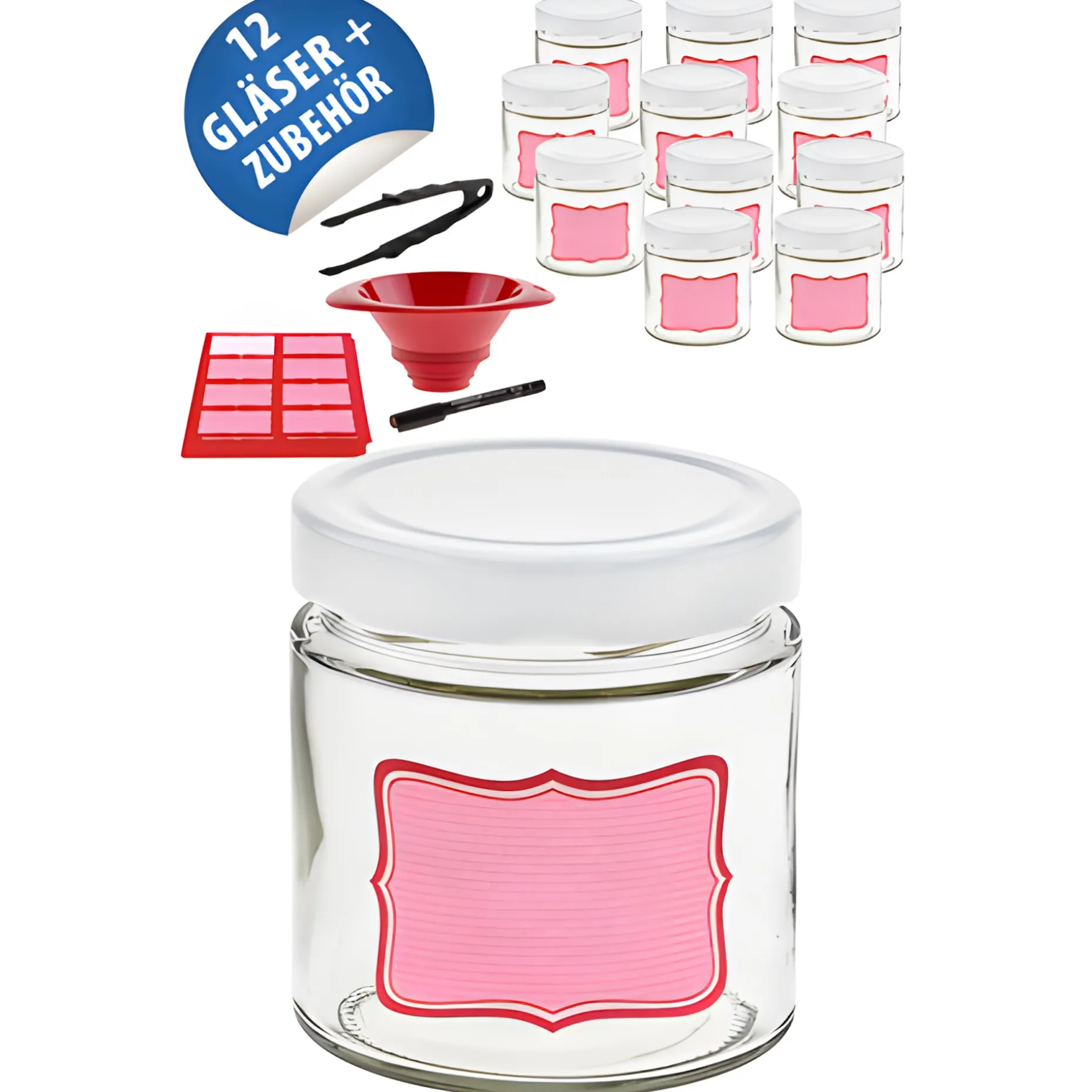 Mit diesem Set bekommen Sie moderne Einmachgläser mit einigen Extras. Die Gläser sind gradlinig und werden mit tiefgezogenen Deep-Deckeln verschlossen, was ihnen eine edle Optik verleiht. Eingelegtes Gemüse, Soßen, Kompott und Honig werden so besonders ansprechend verpackt. Die Twist-Off-Deckel sind für ölhaltige Füllgüter, sowie alles andere Eingekochte geeignet. Dazu gibt es farbenfrohe Etiketten, die dem Ganzen noch den extra Pfiff geben und der beiliegende Stift verwischt auch dann nicht, wenn einmal ein paar Tröpfchen Wasser oder Öl darüber laufen. Der Trichter ist so konzipiert, dass er auch bei größeren Mündungen nicht zu tief in das Glas hineingeht und die Pinzette hat genau die richtige Größe, um das eine oder andere Gürkchen sauber aus dem Glas zu entnehmen. Also alles komplett für unbeschwerten Einkochspaß!