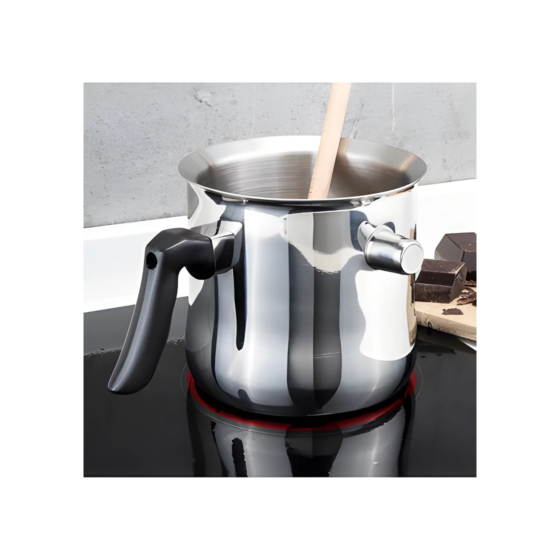 Doppelwandiger Simmer- oder Milchtopf mit handlichem Kunststoff-Griff zum schonende Erhitzen von Lebensmitteln, die nicht kochen dürfen, weil sie sonst gerinnen oder anbrennen können. Der Edelstahltopf mit Flötenkessel-Funktion ist zweiwandig: Wasser wird in den Hohlraum gefüllt und selbst wenn dieses nahezu kocht, erreicht das Füllgut im Topf höchstens 95 °C. Das ist besonders praktisch, wenn man Milchreis, Schokolade, Pudding, Sauce Hollandaise oder selbstgemachten Eierlikör zubereiten möchte.