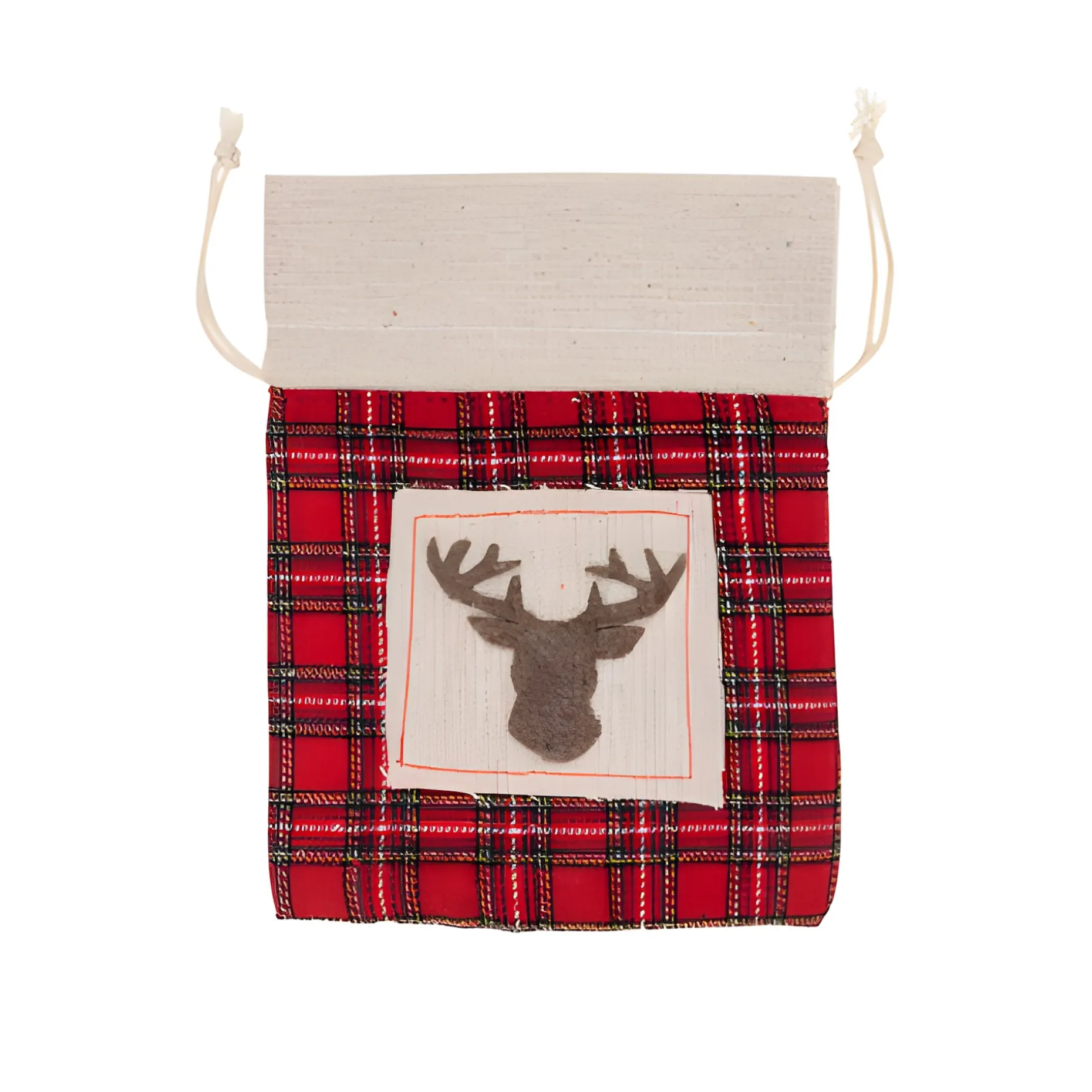 Weihnachtlicher Stoffbeutel mit Zugband. Der rot-karierte Baumwollbeutel mit Rentierkopf ist ideal für kleine Weihnachtsgeschenke oder selbstgebastelte Adventskalender mit Süßigkeiten, kleinen Marmeladengläsern oder Fläschchen mit Vitamin-Shots.