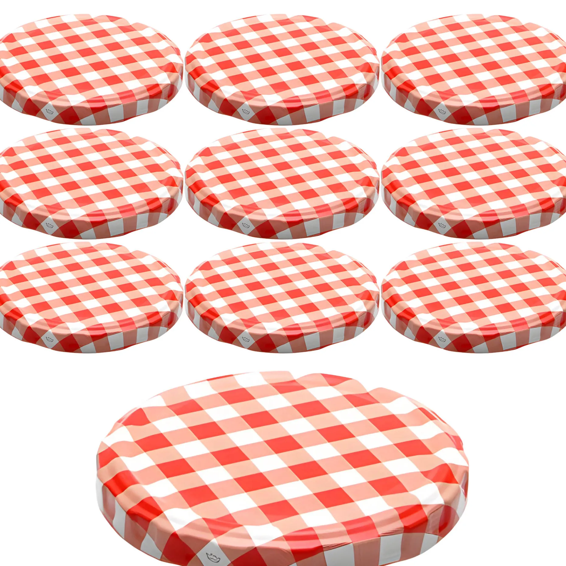 Der rot-weiß karierte Twist-Off-Verschluss im praktischen 10er-Pack passt auf Gläser mit einer TO 82 Mündung (äußerer Öffnungsdurchmesser ohne Gewinde ca. 77,4 mm). Der Twist-Off-Deckel ist erhitzbar bis 120 °C (sterilisierbar) und kann ab einer Füllmenge von 315 ml für ölhaltige Füllgüter eingesetzt werden.
