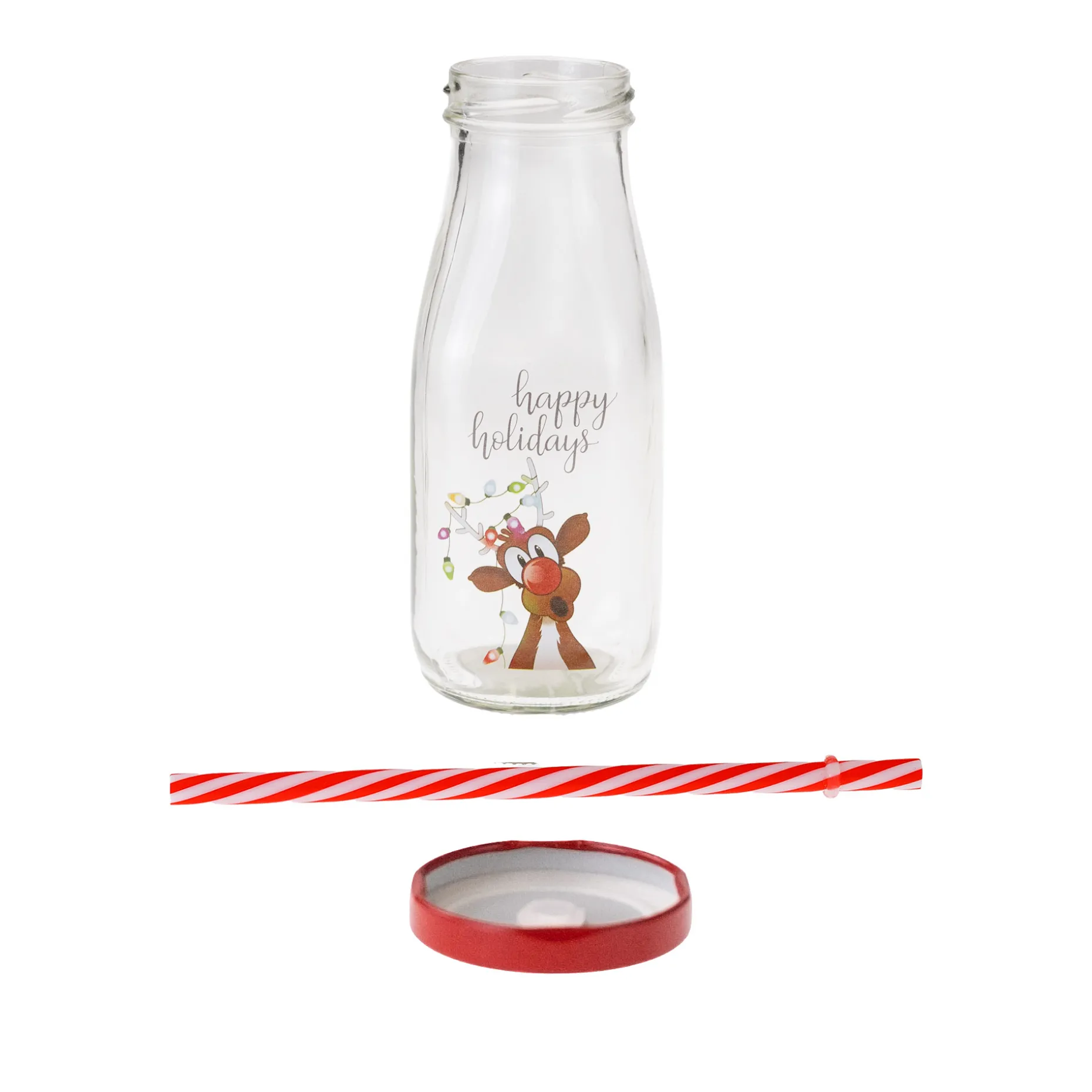 Die hübsche kleine Trinkhalmflasche mit rotem Trinkhalmdeckel und rot-weißem Trinkröhrchen ist der Clou in der Weihnachtszeit. Sie ist auf ihrer Vorderseite mit einem lustigen Rentier-Motiv dekoriert und trägt den Schriftzug ‚Happy Christmas‘.