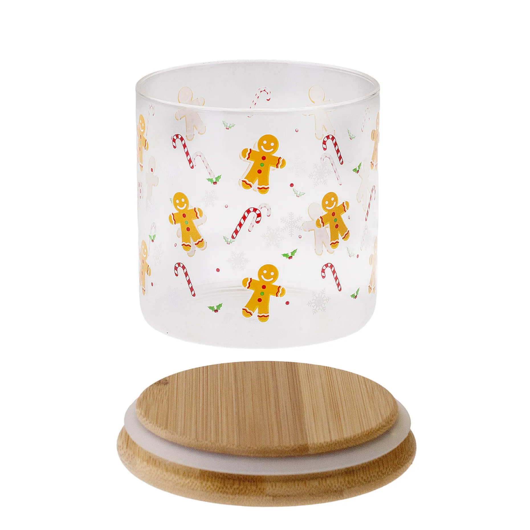 Das hübsche runde Glas mit dem schönen Holzdeckel ist ideal zum Aufbewahren oder Verschenken von selbstgebackenen Weihnachtsplätzchen, Pfefferkuchen und anderen weihnachtlichen Süßigkeiten. Rundherum ist es dekoriert mit vielen kleinen Lebkuchenmännern, Zuckerstangen und Schneeflocken, die genug Platz für einen Blick auf den leckeren Inhalt im Glas lassen.