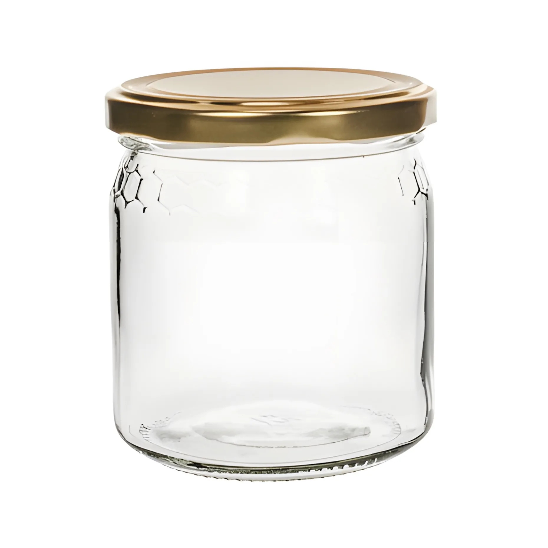 Gläserner Honigtopf mit schönem Wabenrelief, das besonders gut in Erscheinung tritt, wenn das Einmachglas mit süßen Leckereien befüllt ist. Die zeitlose Form und die weite Öffnung machen das Glas zur perfekten Verpackung für Honig, Zuckersirup, Gelee und andere zähflüssige Aufstriche.