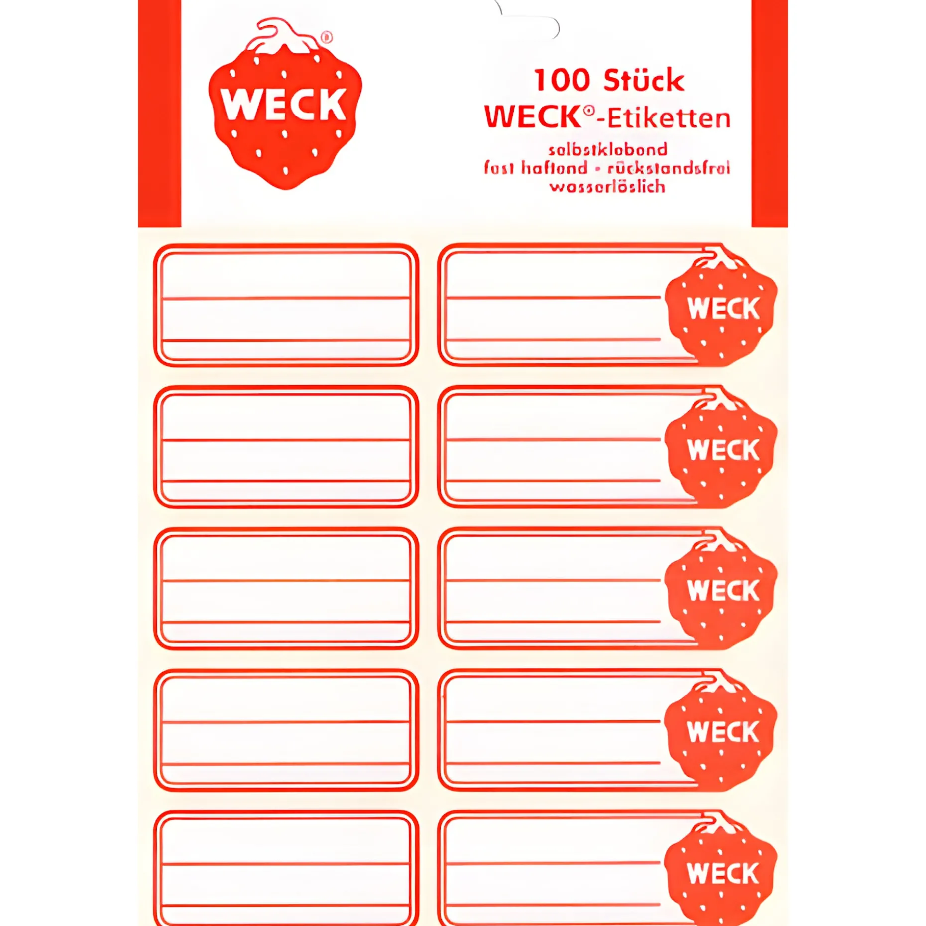 Die selbstklebenden Etiketten mit dem typischen WECK-Logo sehen hübsch aus und lassen sich einfach anbringen. Durch ihren hochwertigen Klebstoff heften sie fest auf dem Glas und lassen sich mit Wasser leicht wieder ablösen, ohne Rückstände zu hinterlassen. Im Beutel à 100 Stück.