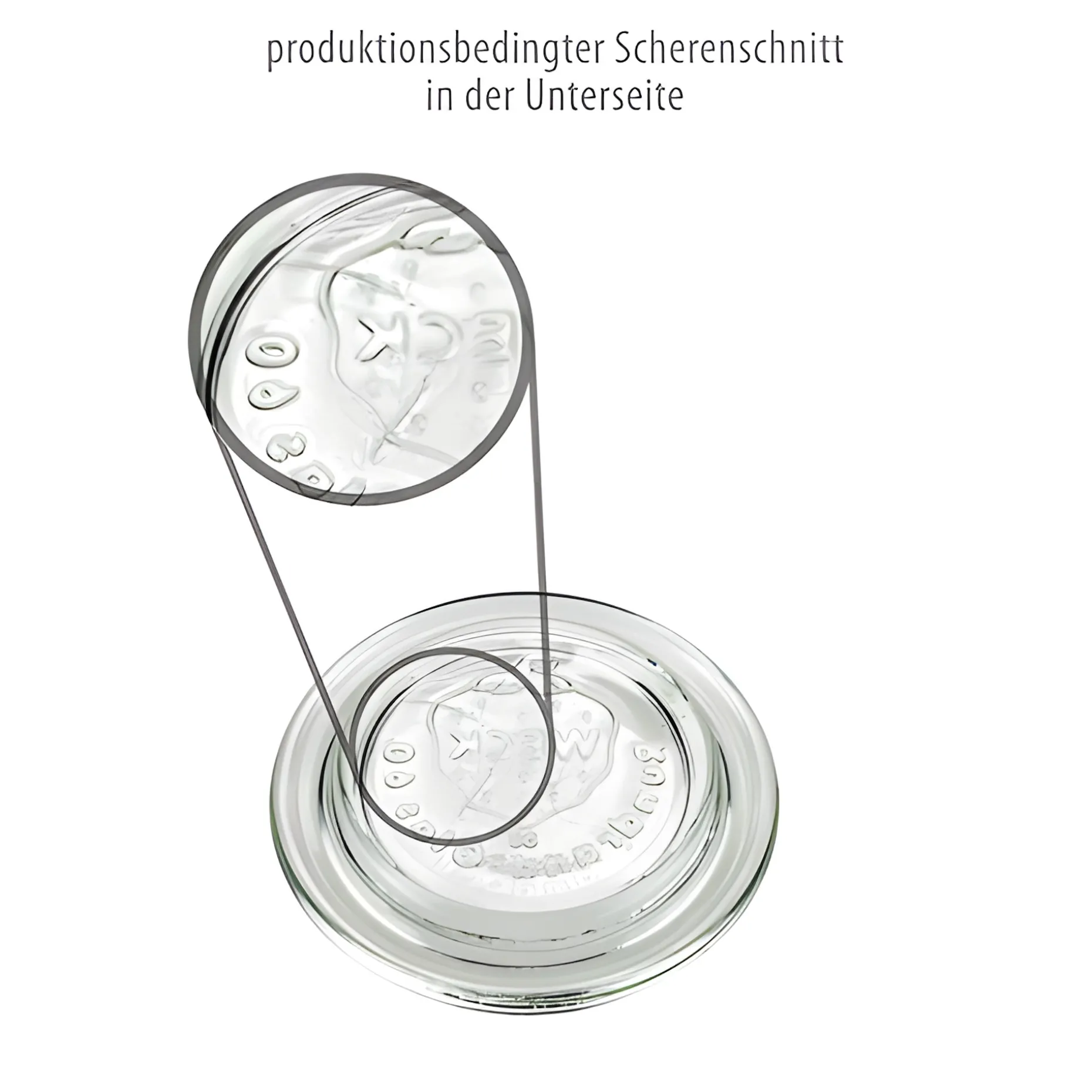 Die Unebenheiten im Bereich der Erdbeere sind nach Aussage der Firma WECK ein sogenannter Scherenschnitt, der produktionstechnisch nicht zu vermeiden ist und je nach Zustand der Schere mehr oder weniger stark im Glas bzw. Glasdeckel vorhanden ist. Der Scherenschnitt ist ein Schönheitsfehler, der die Funktion des Einkochens nicht beeinträchtigt. Glasbrüche wie bei Rissen treten nicht auf, da auch die Festigkeit des Glases nicht vermindert ist.