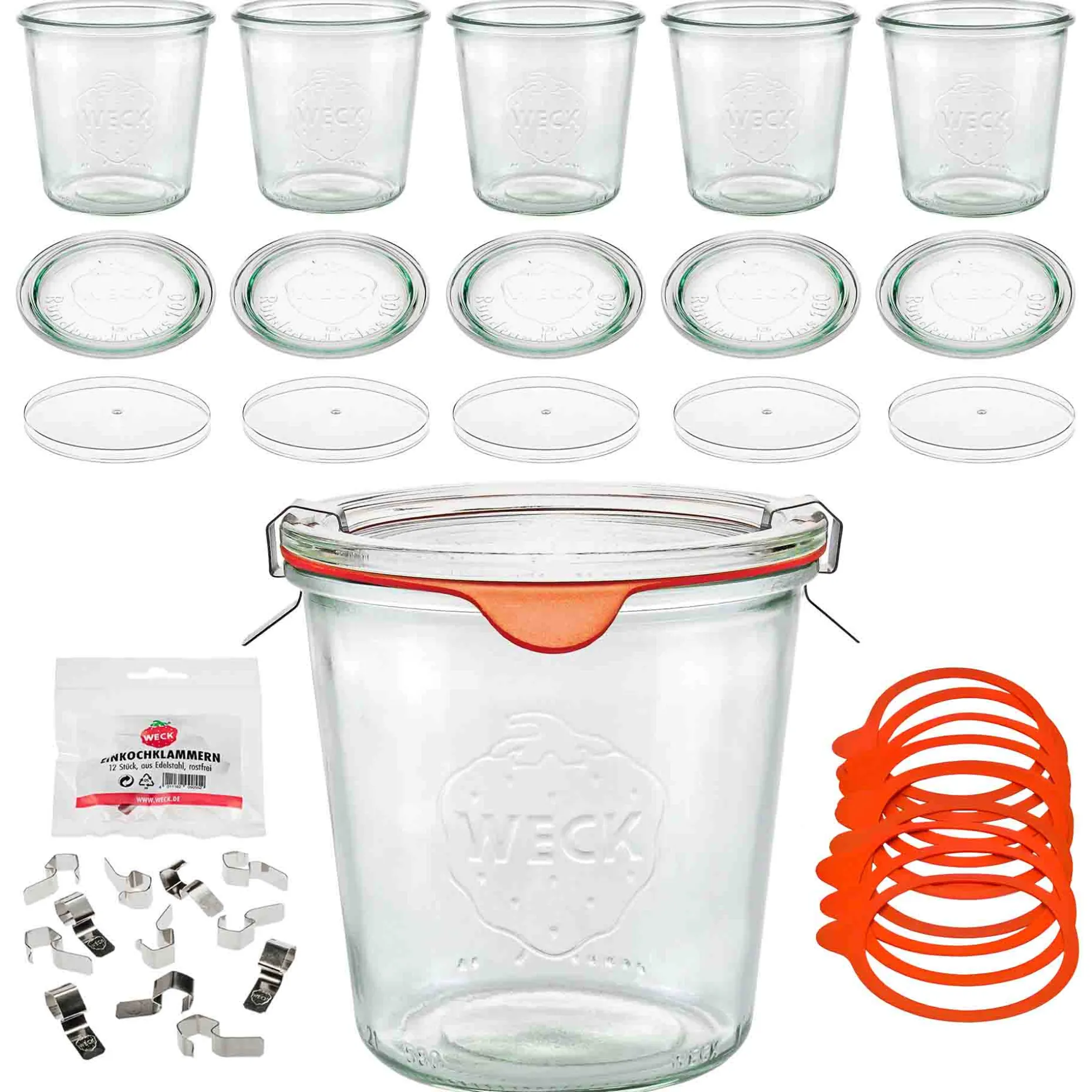Das praktische Set enthält neben WECK-Gläsern, WECK-Klammern und roten Einkochringen zum Einkochen auch Klarsichtdeckel aus lebensmittelgeeignetem Kunststoff (PP), die man einfach über die Gläser stülpen kann, wenn man die vorbereiteten Speisen im Kühlschrank frischhalten möchte. Auch zum Servieren auf dem Buffet sind die transparenten Stülpdeckel super, weil sie schön aussehen und Schutz bieten.