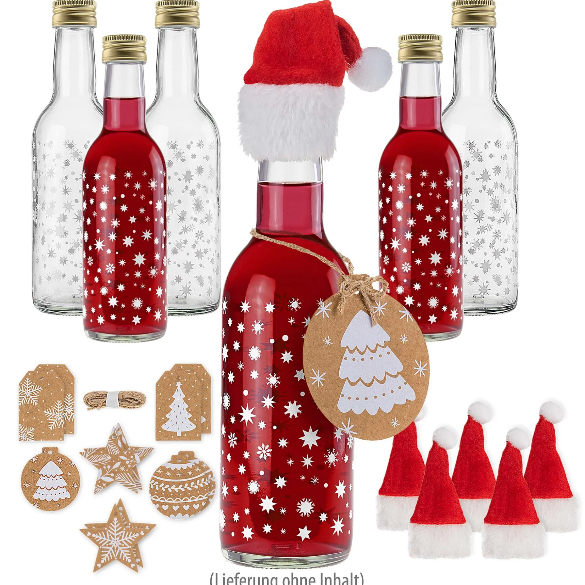 Mit diesem weihnachtlichen Flaschen-Set haben Sie gleich alles zusammen, um selbstgemachten Likör, Sirup oder Saft in der Adventszeit dekorativ zu verschenken oder zu servieren. Die winterlichen Motivflaschen sind dezent mit kleinen Sternen bedruckt, sodass Ihr Selbstgemachtes darin wunderschön zur Geltung kommt. Farbige Inhalte wie dunkelroter Granatapfel-Likör oder knallgelber Orangenglühsirup bringen die weißen Sterne zum Leuchten. Auch als Servierflasche auf dem Weihnachtsbuffet macht die schlichte Klarglasflasche mit weißem Sternendruck viel her und kann auch super mit goldgelbem Olivenöl oder Himbeeressig befüllt werden.